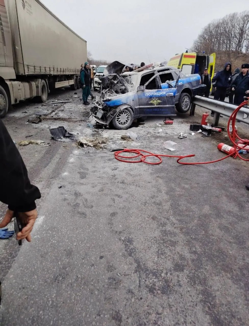 В результате ДТП двое мужчин - сотрудники Госавтоинспекции: водитель и пассажир, находящийся на переднем пассажирском сидении, получили телесные повреждения.