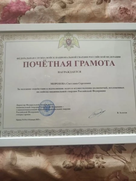 Приказом директора Федеральной службы войск национальной гвардии Российской Федерации - главнокомандующего войсками национальной гвардии Российской Федерации генерала армии Виктора Золотова за оказание содействия в выполнении задач и осуществлении полномочий, возложенных на войска национальной гвардии Российской Федерации Российской Федерации, Почетной грамотой награждена член Общественного совета при УМВД России по Приморскому краю, Председатель Совета почётных граждан Владивостока и Приморского края Светлана Морозова.