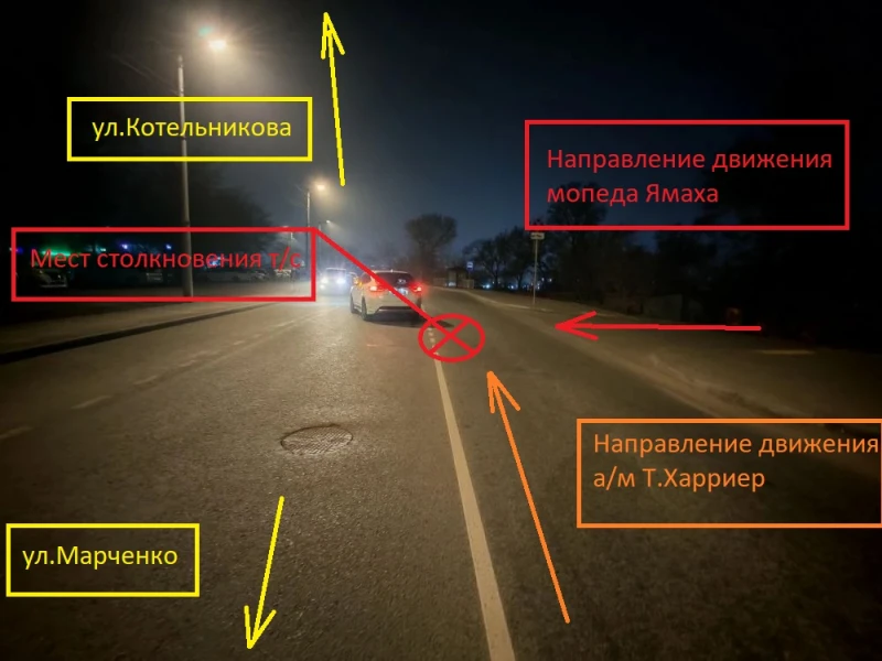 Так, 27 апреля в 16.40 в районе дома № 34 на улице Жигура 15-летний водитель мопеда Ямаха при выезде с прилегающей территории не уступил дорогу автомобилю Тойота Харриер, который двигался по улице Жигура со стороны Марченко в направлении Котельникова по главной дороге.