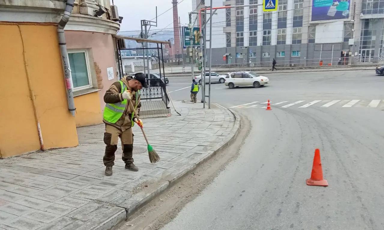 Первомайский район — комплексная уборка на улицах Сахалинской и 50 лет ВЛКСМ; прометание тротуаров на улице Коммунаров.