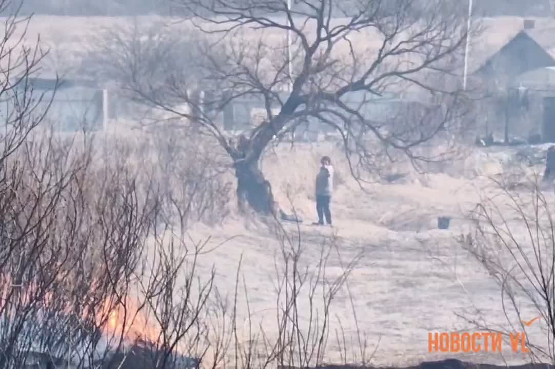 В Октябрьском районе пожарные тушат возгорание сухой растительности в селе Галёнки. Огонь, подгоняемый сильным ветром, идёт по обочине дороги и участкам частных домов, угрожая и самим постройкам. Пожарная служба Приморского края сбивает пламя воздуходувками, а местные жители, чьи дома под угрозой, помогают своими силами — кто курткой, кто ведром воды.