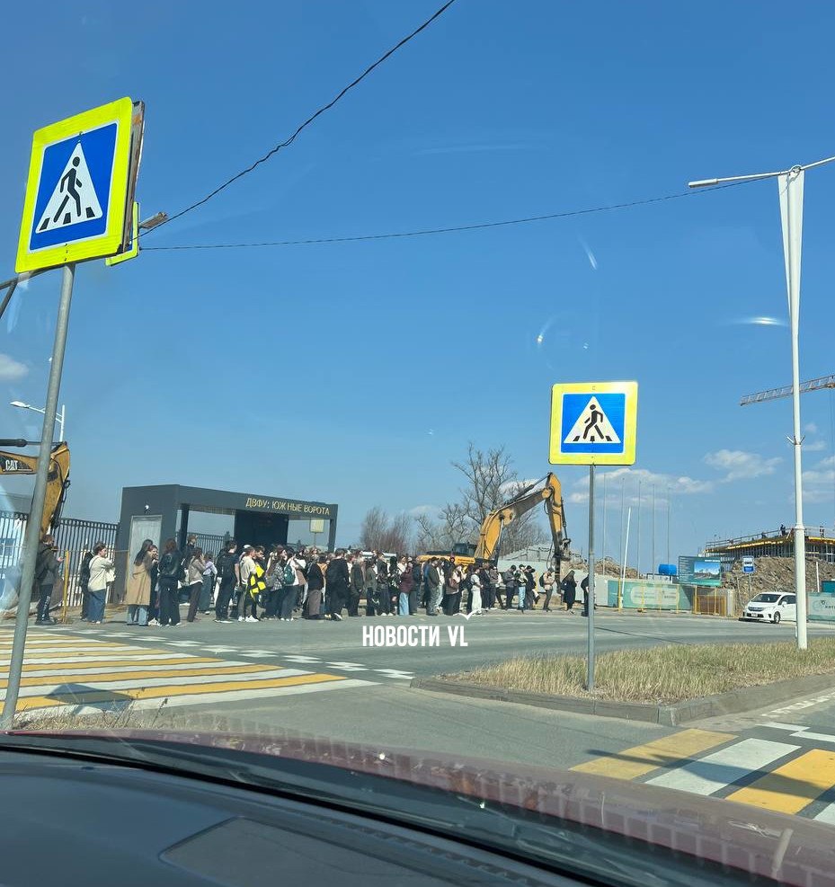 На остановках возле ДВФУ в связи с пробкой ждёт автобусы огромное число пассажиров. Студенты идут на остановки «Пожарная академия» и «Бухта Парис», чтобы влезть в автобус.