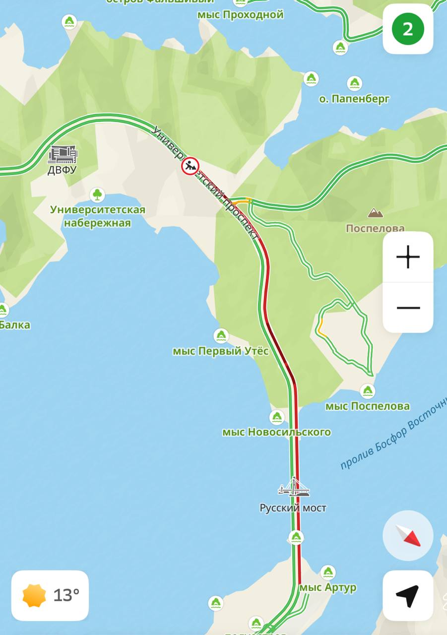 Огромная пробка собралась в сторону Русского острова во Владивостоке из-за раскопок в районе мини-ТЭЦ. Многие едут отдохнуть к морю в тёплый выходной и застревают в дороге минимум на час.
