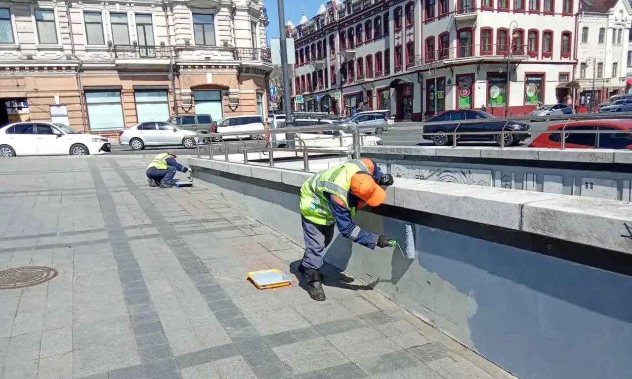 Специализированная бригада выполняет восстановление входных зон в подземных пешеходных переходах на улице Светланской.