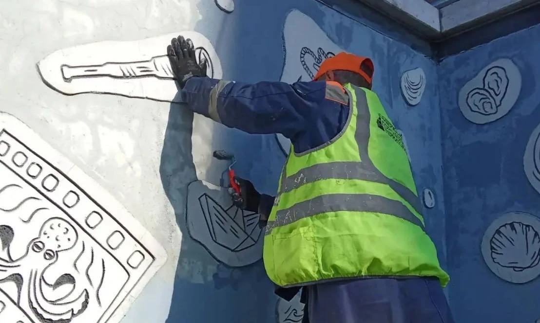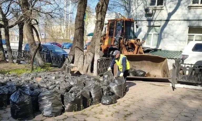 Русский остров — вывоз мешков после субботника в бухте Парис; помывка тротуаров в посёлках Канал и Поспелова.