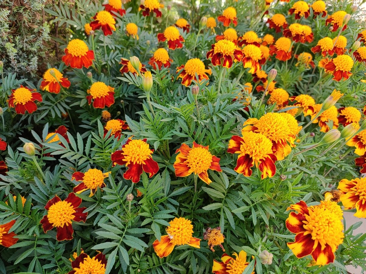 Симпатичные кустики бархатцев радуют глаз своими махровыми цветами различных оттенков: от ярко-оранжевого до глубокого бордового. Эти цветы могут достигать высоты до 50 см и прекрасно себя чувствуют на солнечных местах. Они устойчивы к засухе, но дополнительные поливы и подкормки помогут им лучше цвести с начала лета до поздней осени.