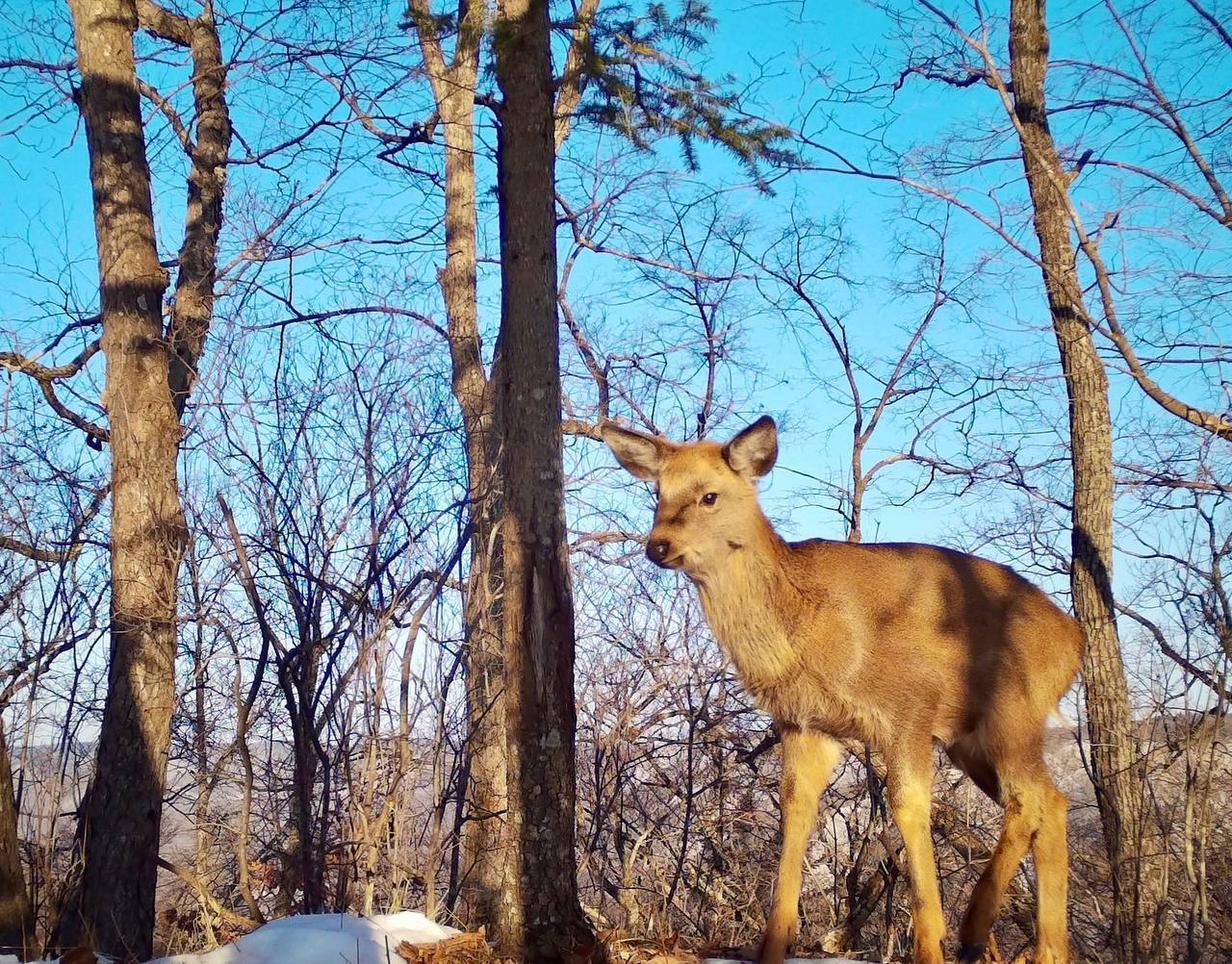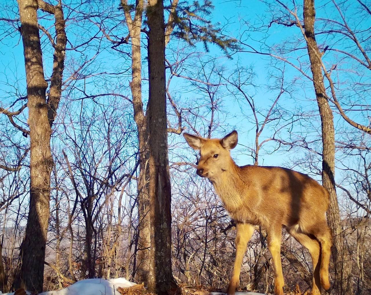 Маленькая олениха вышла на прогулку и решила покрасоваться перед фотоловушками.