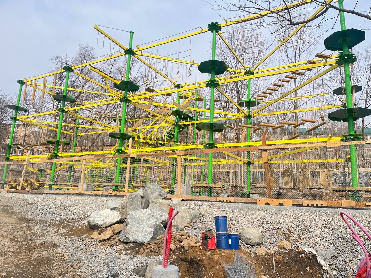 В парке уже выполнена зона спортивных игр. Завершаются работы в зоне детских аттракционов и верёвочный парк.