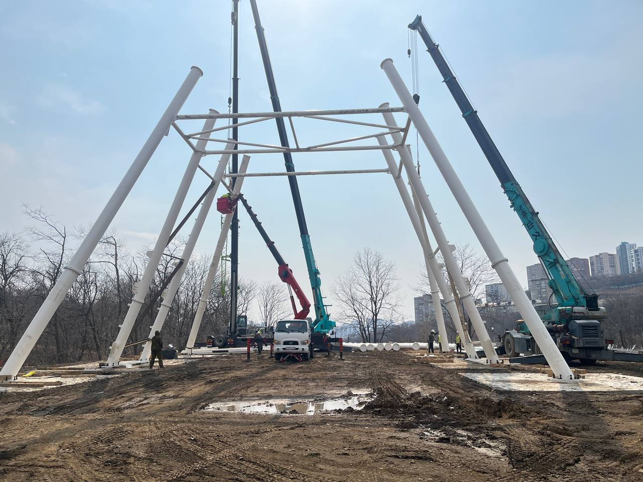Ведётся монтаж конструкций ангара, мастерских, а также начаты работы по устройству фундамента кафе-оранжереи. Параллельно прокладываются сети электроснабжения, водоснабжения, канализации и связи, ведётся монтаж колеса обозрения.
