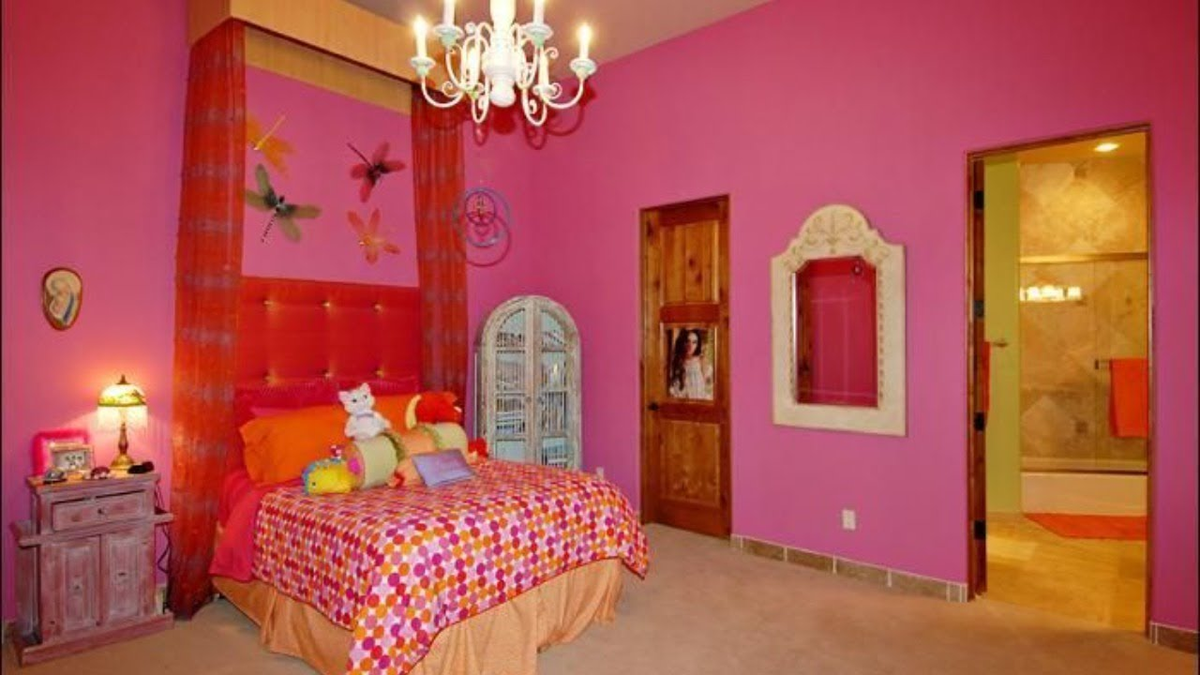 В данной комнате используется огромное количество розового цвета, что вызывает противоречивые чувства. Установленная плитка используется как напольный плинтус, и это решение выглядит довольно нелепо. Хотя плитка может отлично смотреться в ванных комнатах, в жилых помещениях такой выбор явно неуместен.