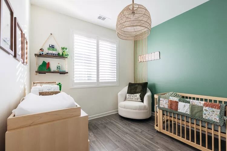 - Нежные акценты. Комбинация зеленого с розовым может показаться необычным выбором, но яркая акцентная стена делает спальню запоминающейся, при этом сохранив все необходимое чувство стиля.