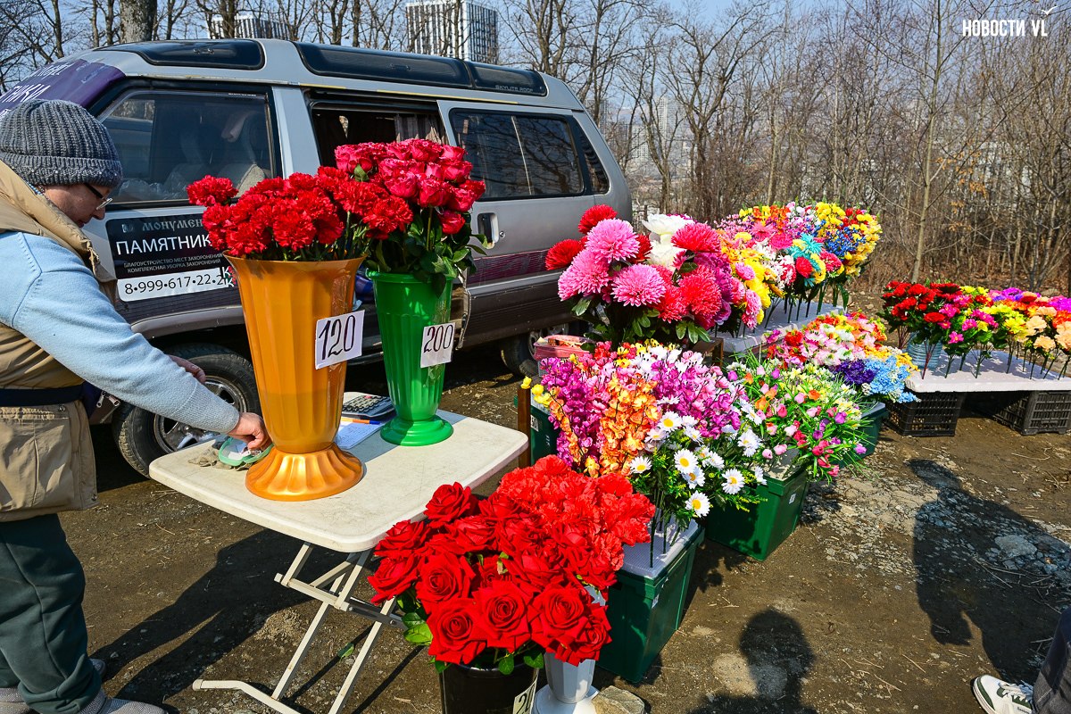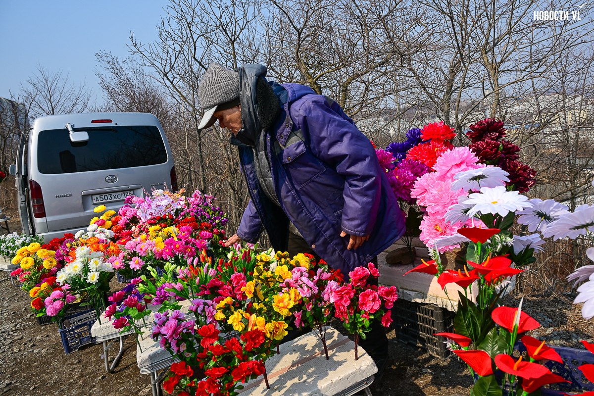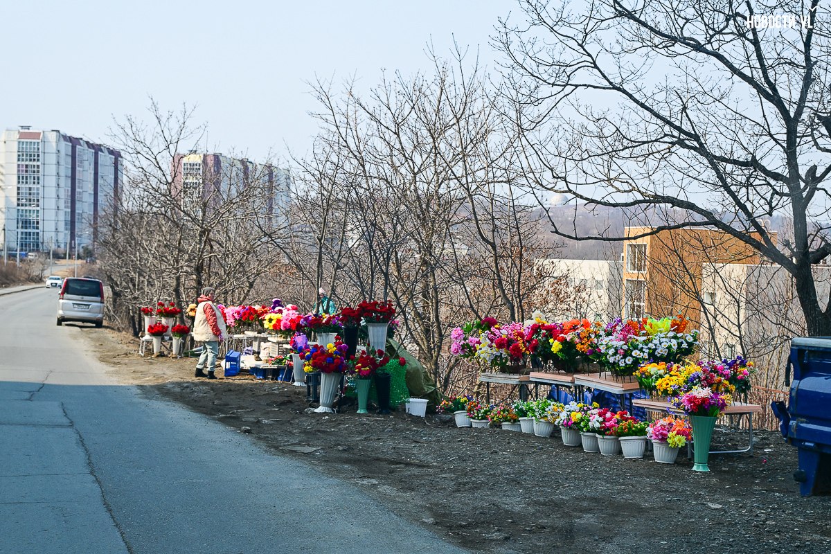 Во Владивостоке потеплело, горожане потянулись на Морское кладбище навестить могилы близких. И тут же повылезали предприимчивые торговцы искусственными цветами. Они занимают обочины оживлённой дороги, а их покупатели, притормаживая выбрать пластиковый букет, тормозят движение для всех остальных.
