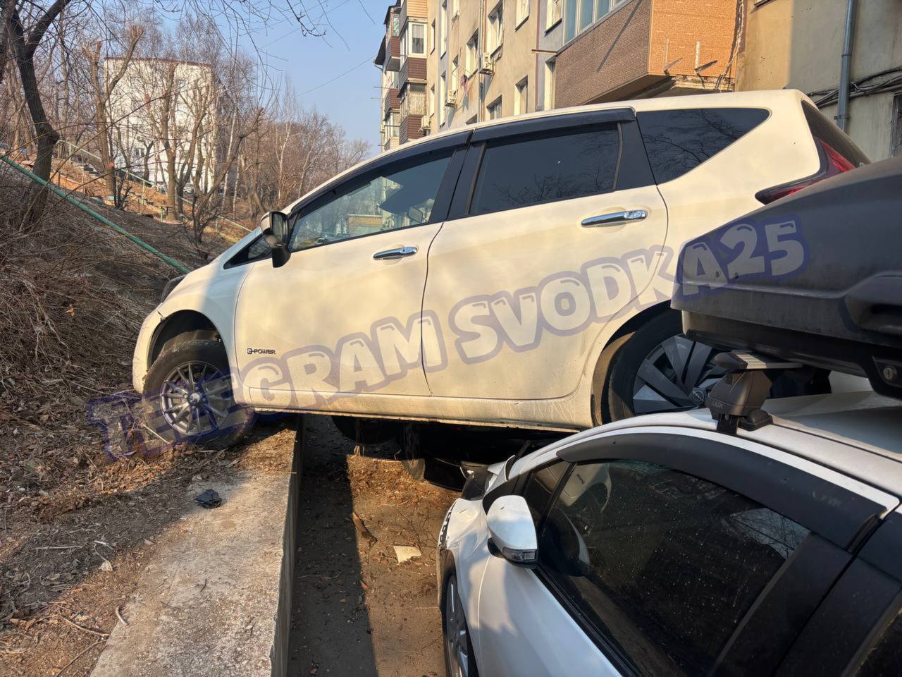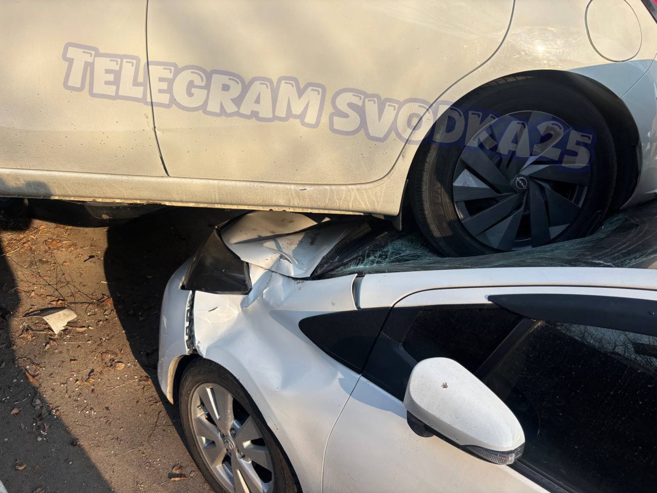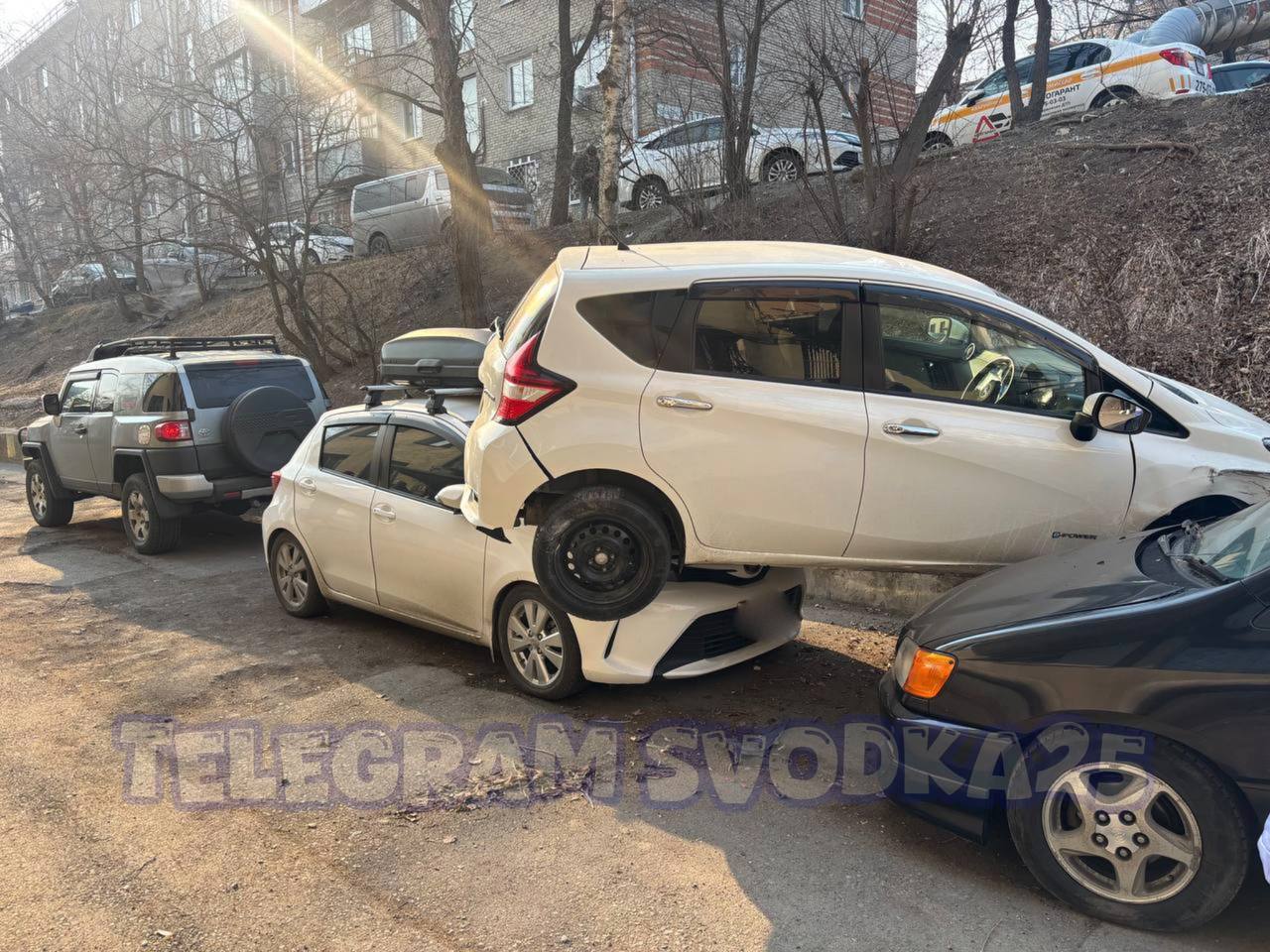 На Калинина во Владивостоке девушка на иномарке с косогора «упала» на припаркованные авто