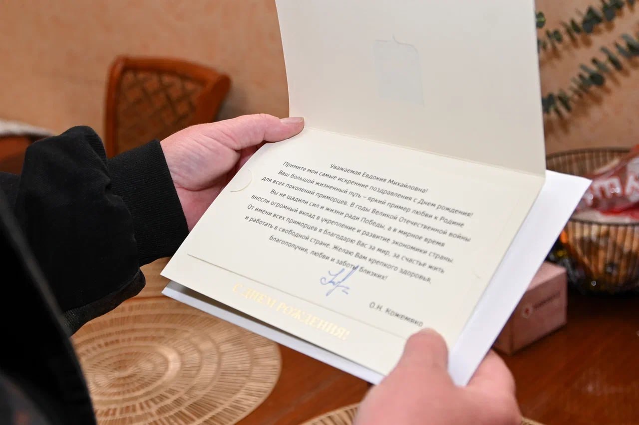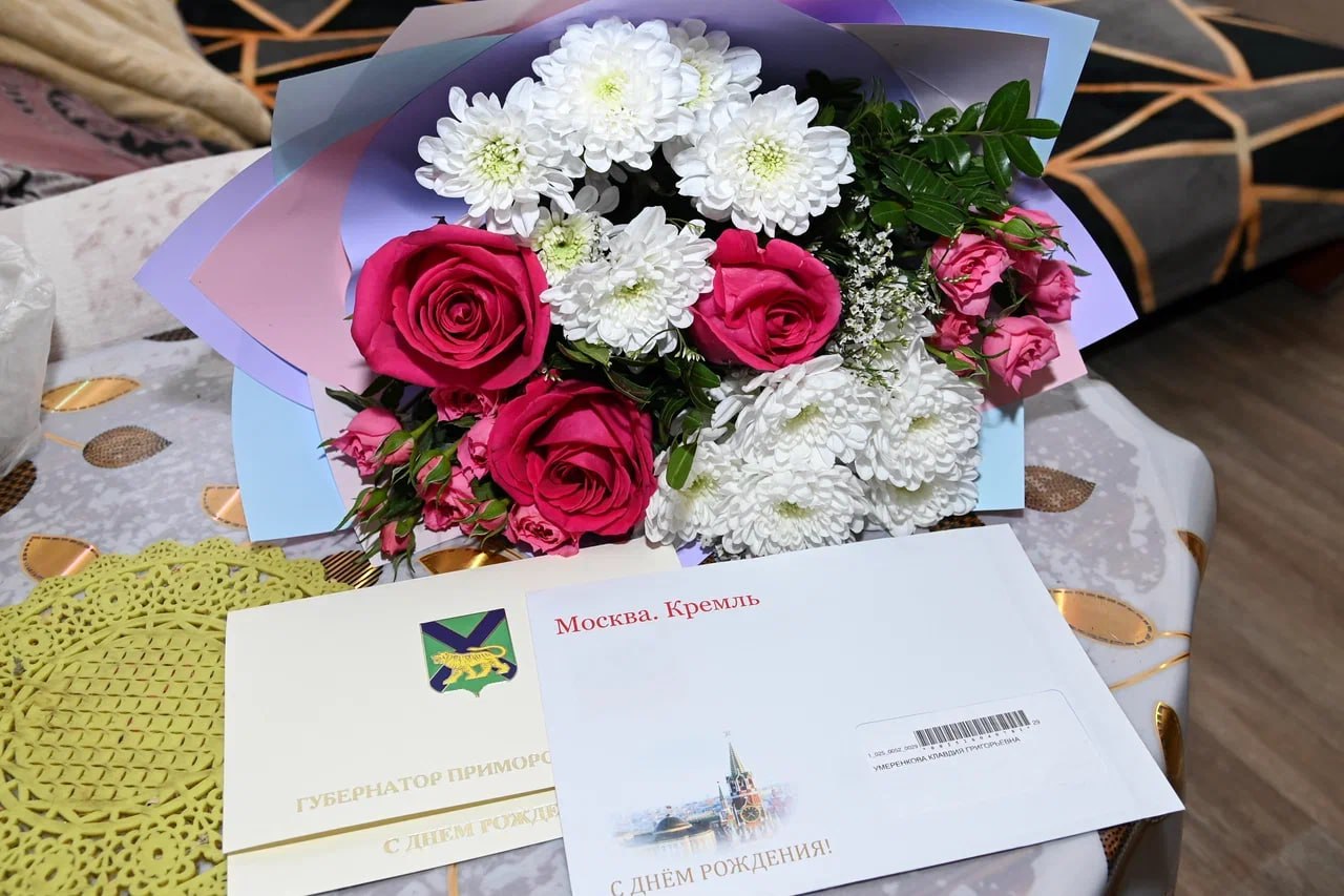 Гости вручили именинницам поздравительное письмо от Президента Российской Федерации Владимира Владимировича Путина и губернатора Приморского края Олега Кожемяко, а также цветы от главы города Тимура Магинского.
