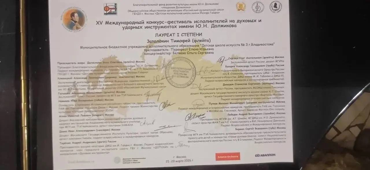 Флейтист из Владивостока Тимофей Затолокин стал лауреатом 1 степени в Международном конкурсе исполнителей на духовых и ударных инструментах имени Ю.Н. Должикова.