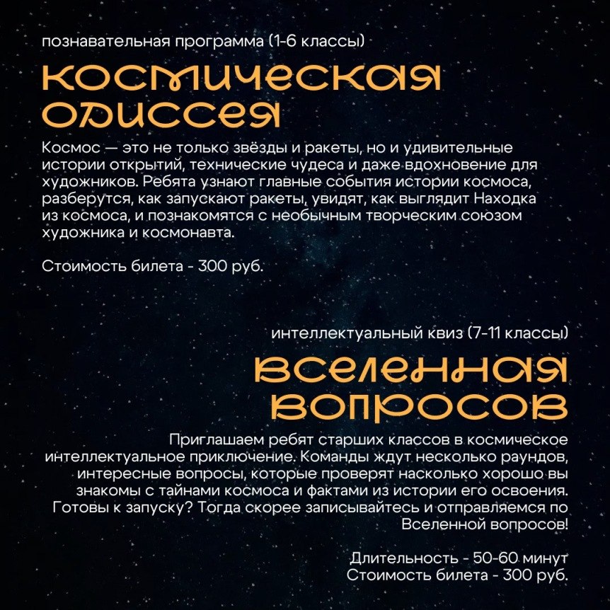 Учащиеся 1–6 классов — познавательная программа «Космическая одиссея», где ребята узнают об истории освоения Вселенной, устройстве ракет и увидят, как выглядит Находка из космоса.