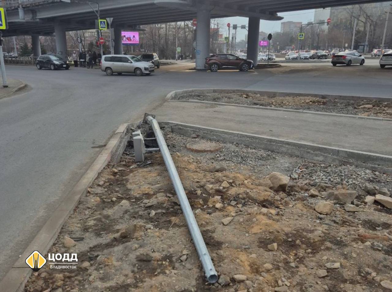 На перекрёстке проспекта 100-летия Владивостока и улицы Русской заменили опору пешеходного светофора, которую повредили в результате ДТП ещё в середине марта.