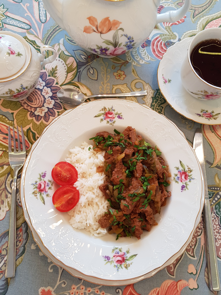 Азу подавайте горячим с вареным рисом, посыпав мелко нарезанной зеленью. Приятного аппетита!