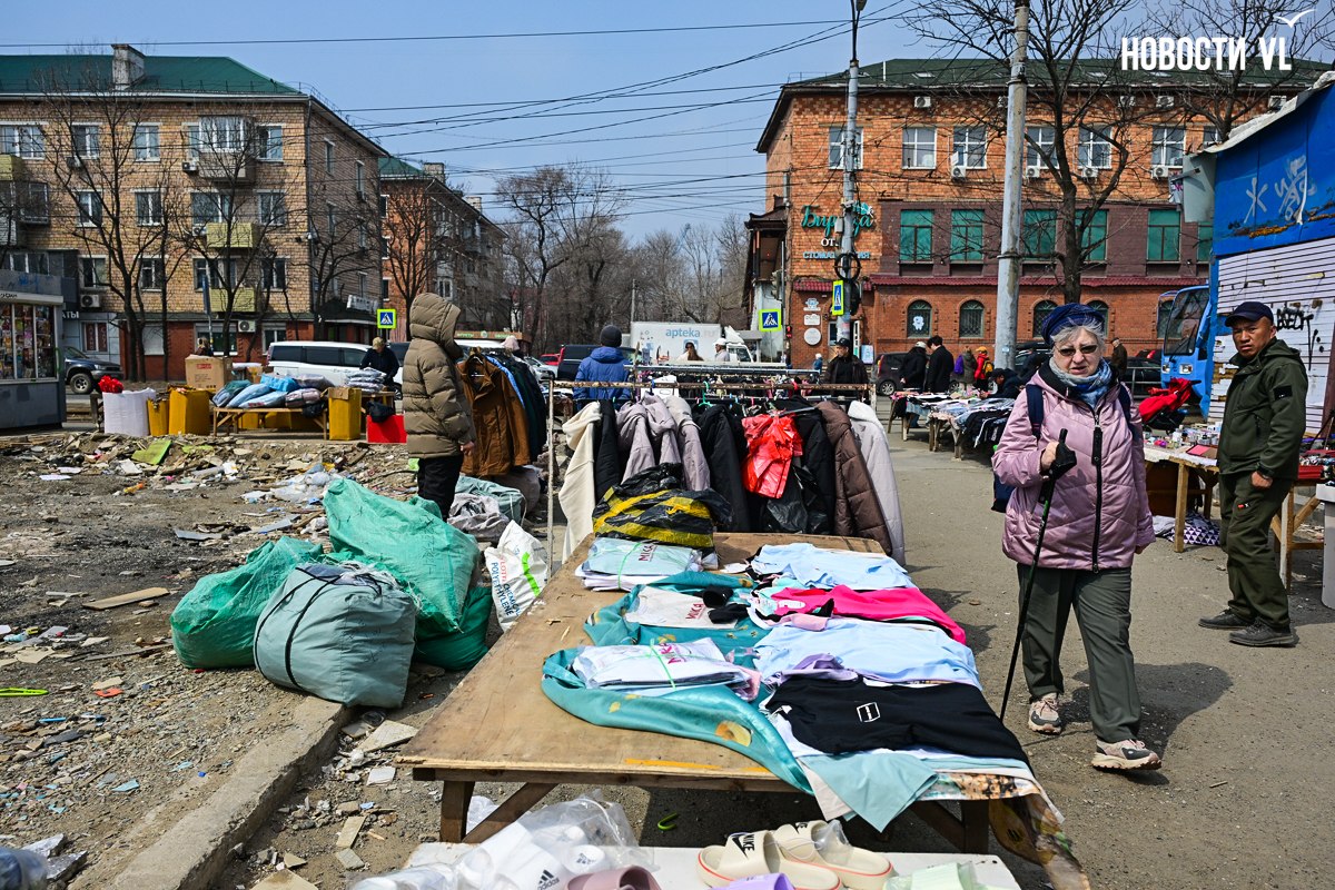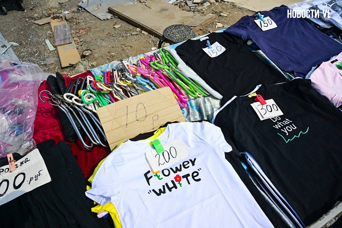 Рынок на Спортивной с наступлением тепла начал оживать. Около трамвайной остановки продавцы расставили столы и разложили свой товар: одежду и обувь в основном. Они надеются ещё поработать, потому что вещей осталось много. Торгуют прямо на руинах рынка – а куда им деваться? Да и покупатели как будто не обращают внимания на свалку строительного мусора.