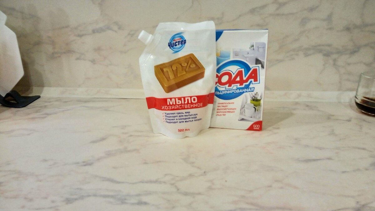 - Добавьте 300 мл хозяйственного мыла и 5 столовых ложек кальцинированной соды. Если нет кальцинированной соды, подойдет и пищевая. Залейте все водой и оставьте на один час.