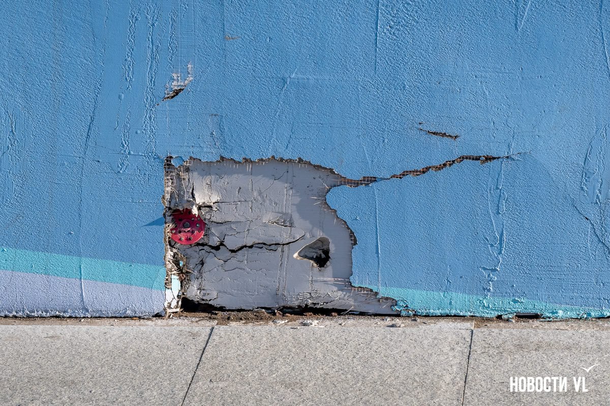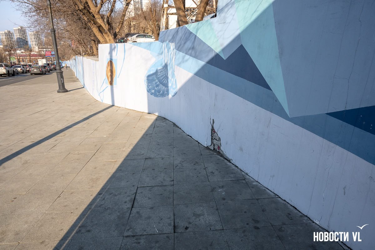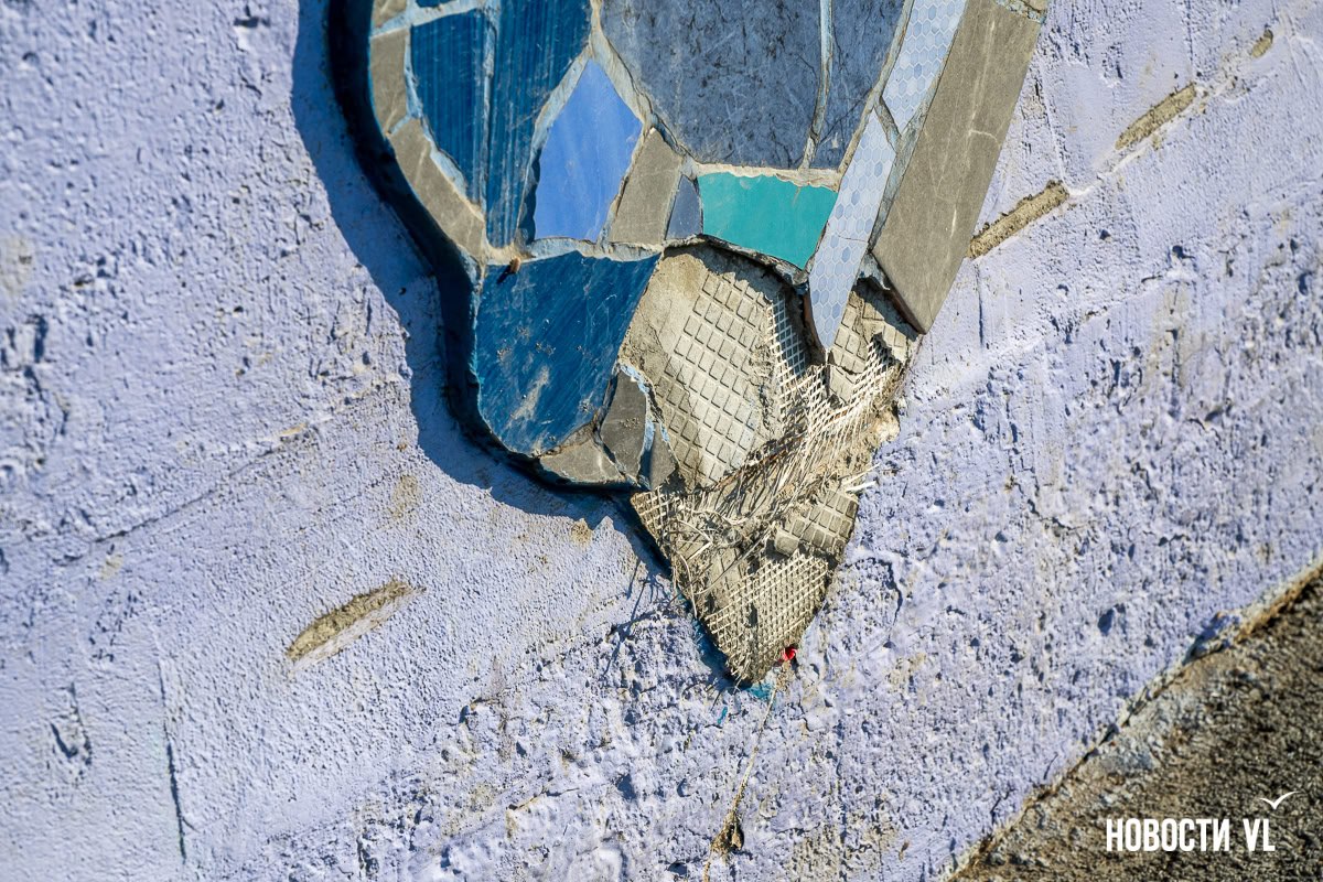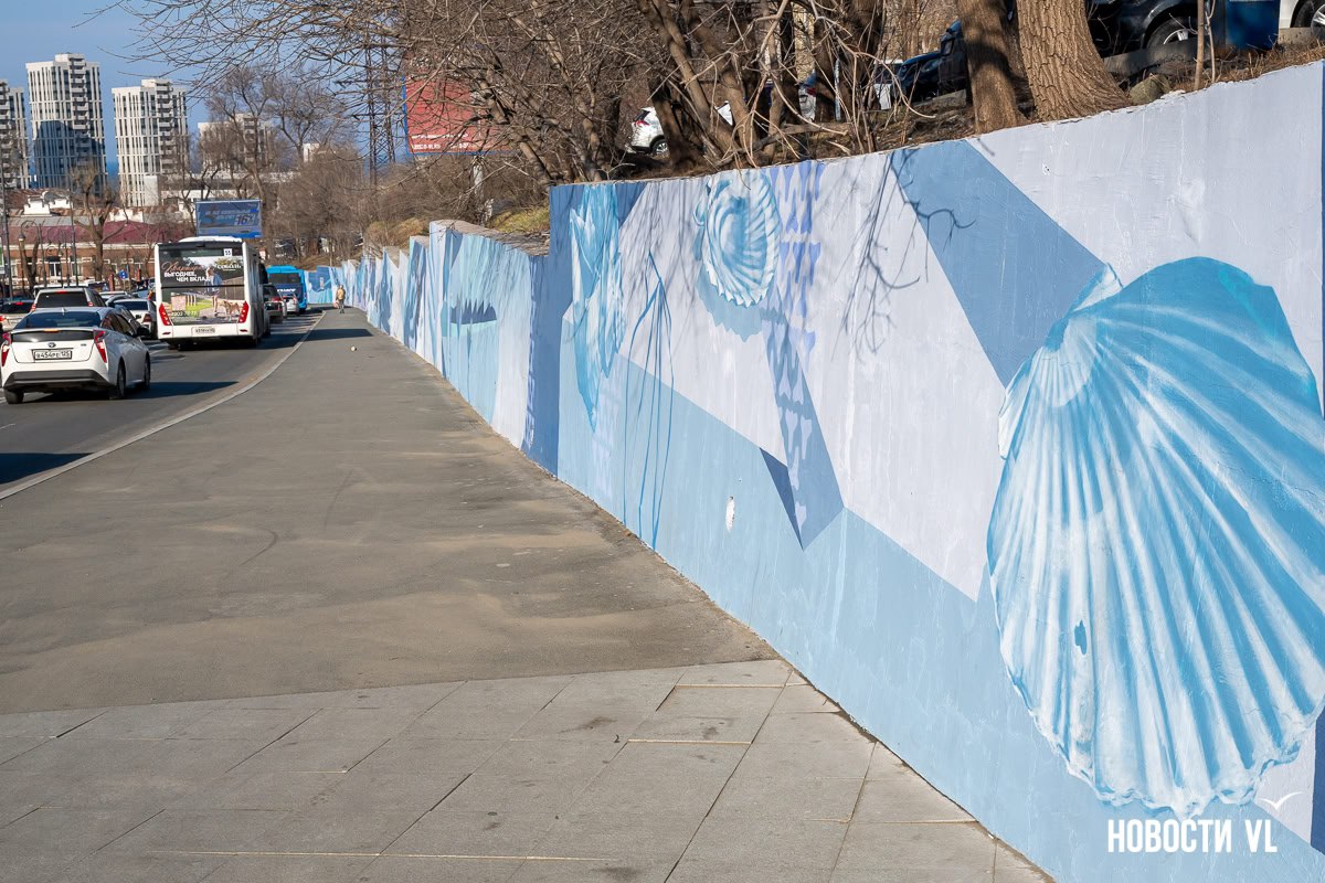 В прошлом году творческая команда художников отреставрировала огромную стену в переулке Павленко, которая тянется от музея ДВГУ до крайбольницы. На ней появилась роспись с морскими элементами, а также несколько мозаичных панно с представителями дальневосточной фауны. Правда, зиму стена пережила не очень хорошо – часть штукатурки отвалилась, а мозаику с моржом кто-то сломал. К ремонту стены художники рассчитывают приступить на этой неделе.