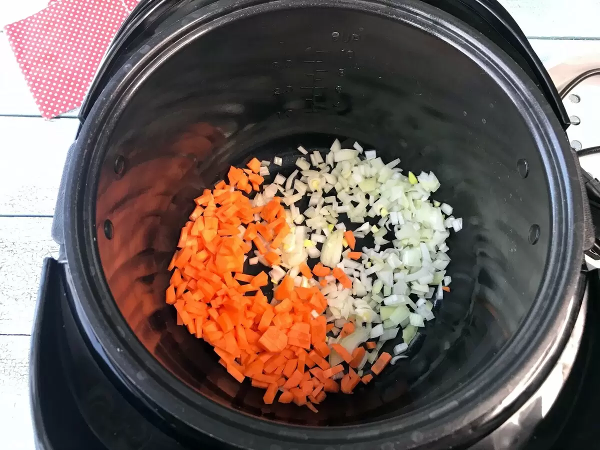 Приготовление начинается с небольших предисловий. Лук и морковь необходимо нарезать мелкими кусочками. Затем можно включить режим жарки в мультиварке и обжарить овощи в растительном масле до мягкости. Это займет всего несколько минут.