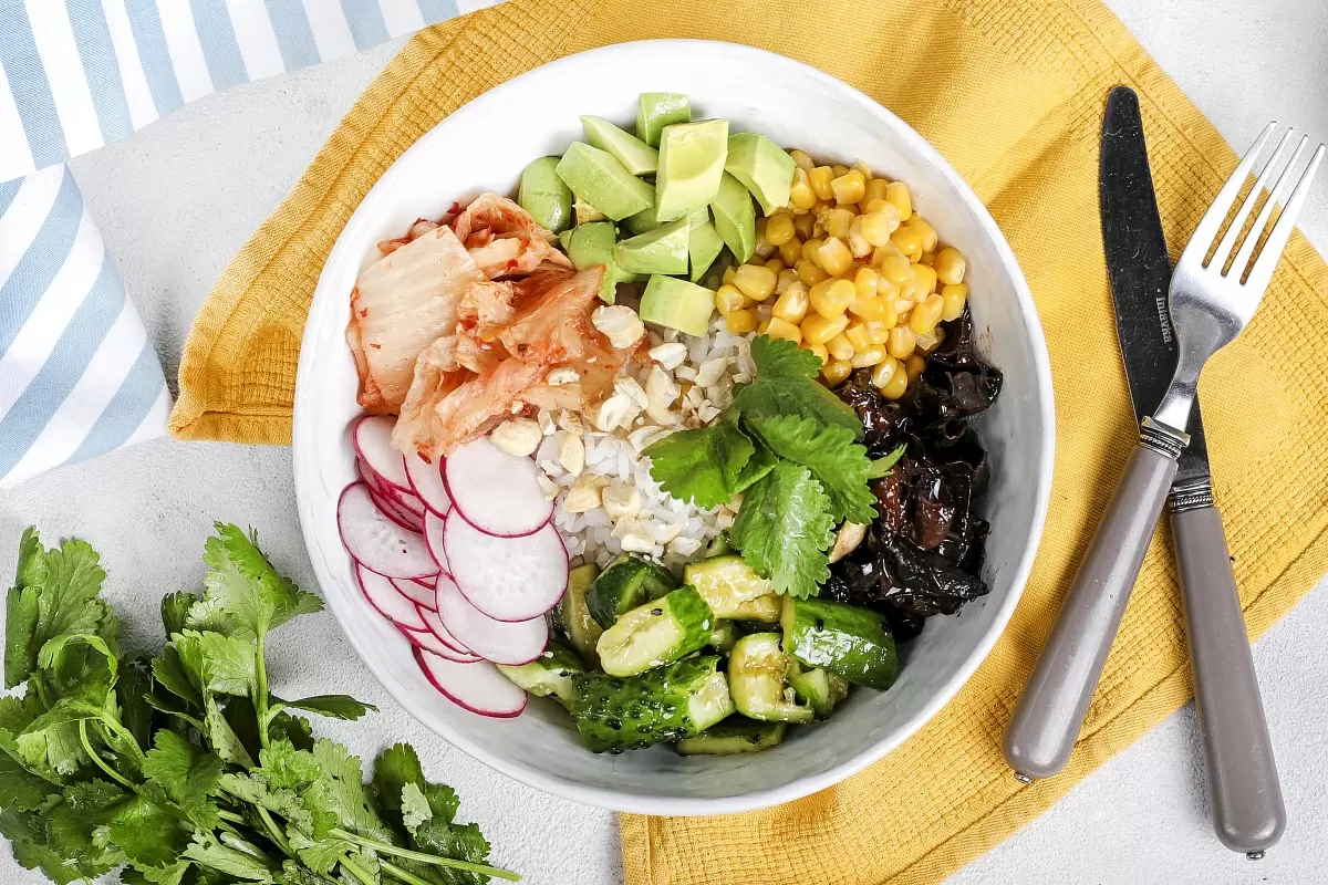 Теперь самое время собрать поке! В глубокой тарелке на весь объем выложите рис, а сверху разместите редис, авокадо, кимчи, просушенную кукурузу, древесные грибы и огурцы. Все это украсьте жареными кешью и посыпьте кунжутом. Блюдо готово! Приятного аппетита!