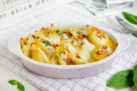 Шаг 5: Наполнить конкильони полученной начинкой и разместить их в форме для запекания.