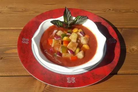 Готовый гаспачо переливают в тарелку и украшают мини-кубиками veggies, а также чесночными гренками. Веточка свежего базилика добавляет финальный штрих и придает блюду изысканный вид. Для особого охлаждающего эффекта не помешает добавить в суп несколько кубиков льда.