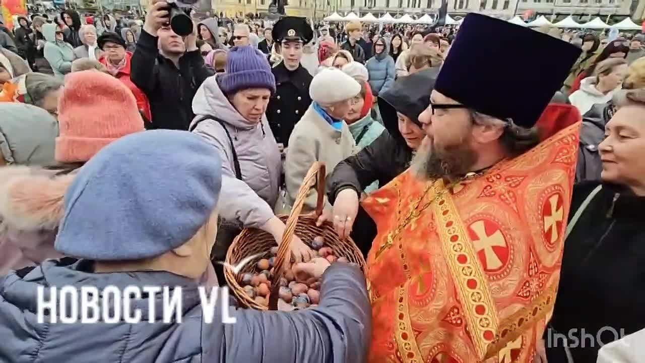 На центральной площади Владивостока сегодня всем желающим раздавали освященные пасхальные яйца. Все прошло спокойно, без давки, как бывало раньше. Возможно, горожан смутили фотограф и оператор Новостей VL, которые в этом момент стояли с камерами. Люди даже как будто немного стеснялись, и батюшка подбадривал их: берите, можно даже в две руки!