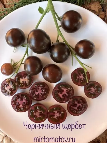 Плоды этого сорта небольшие, но имеют идеальную округлую форму и вес около 20 грамм. Их уникальная окраска меняется по мере созревания: от зеленого с фиолетовыми пятнами до насыщенного фиолетово-малинового цвета с глянцевым блеском. Именно антоцианы обеспечивают такой эффект и могут повышать устойчивость растений к стрессам, например, к яркому солнечному свету.