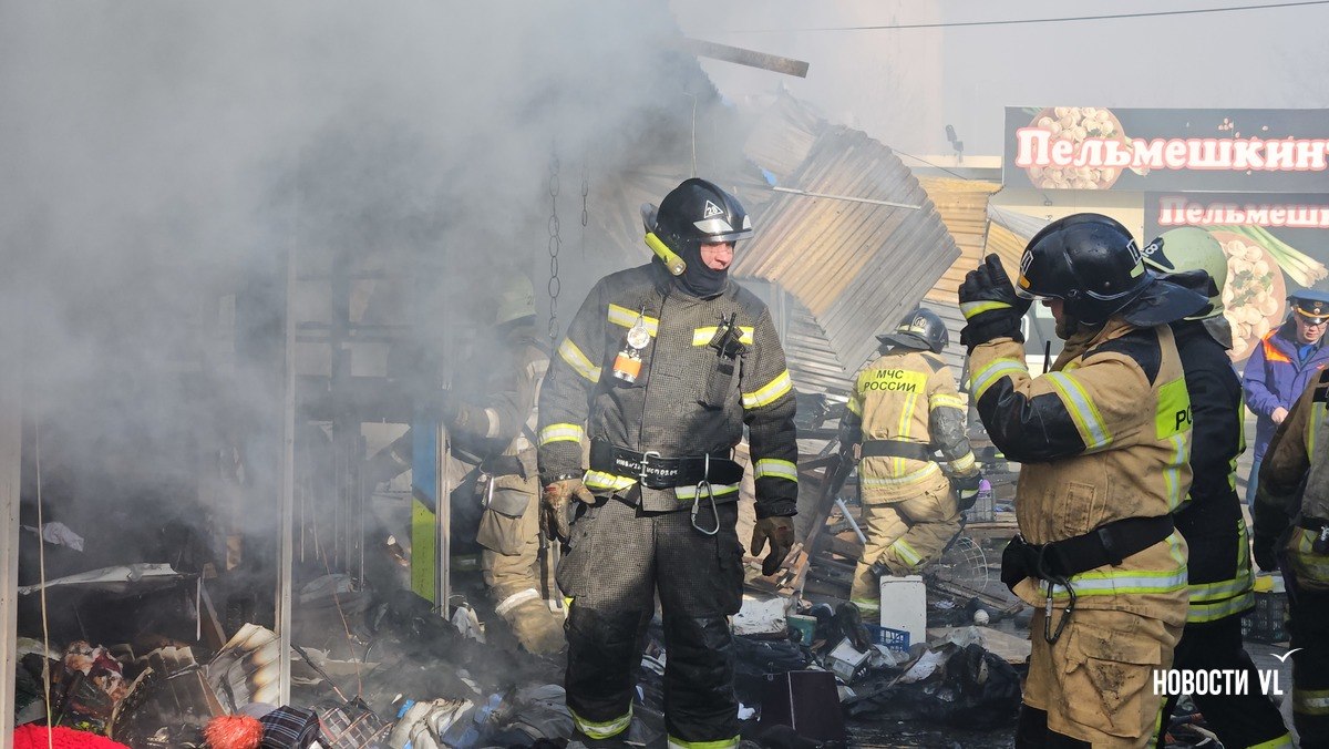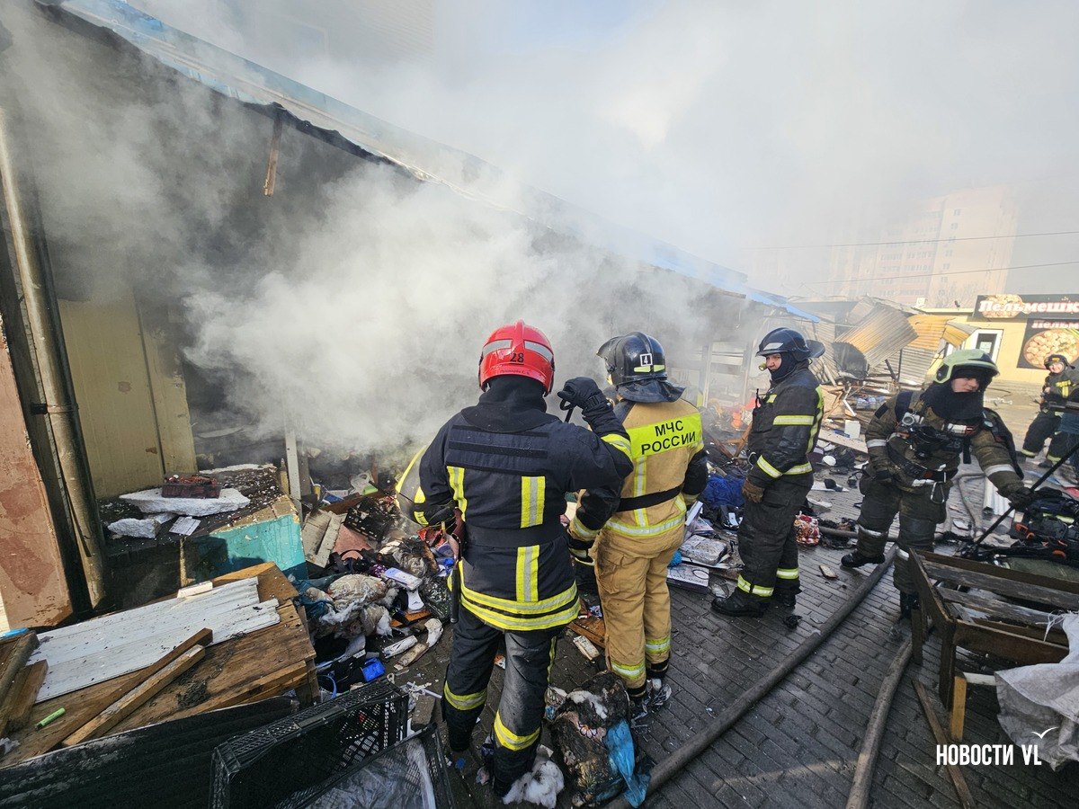 Как сообщает корреспондент Новостей VL, сгорело несколько торговых точек, в которых вьетнамцы продавали вещи и одежду. Пожарные отогнали зевак подальше, потому что в огне периодически взрываются газовые баллончики.