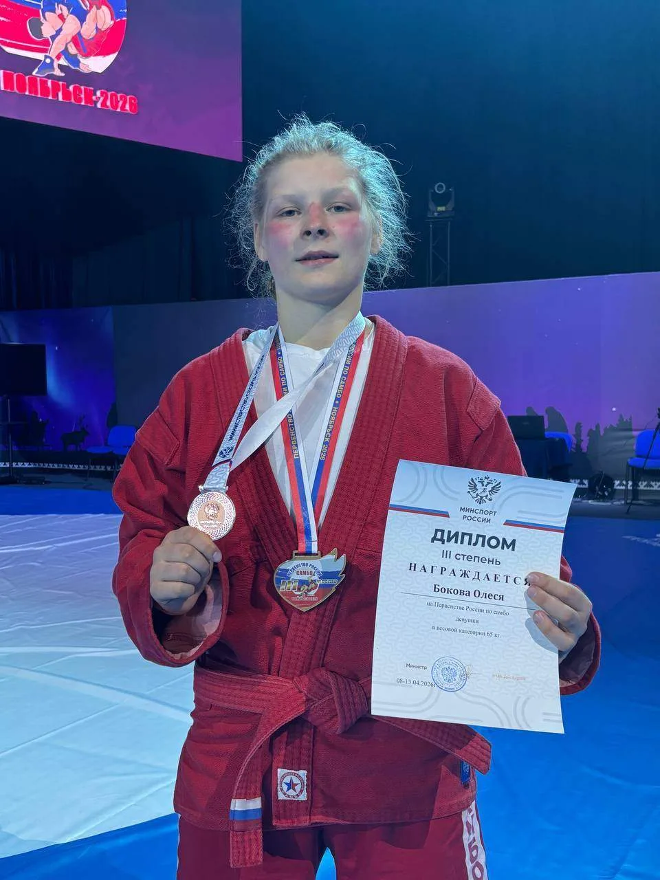 В Ноябрьске прошло Первенство России по самбо среди юношей и девушек 14–16 лет. В своей весовой категории, где боролись 24 участницы, уссурийская спортсменка Олеся Бокова завоевала бронзовую медаль.