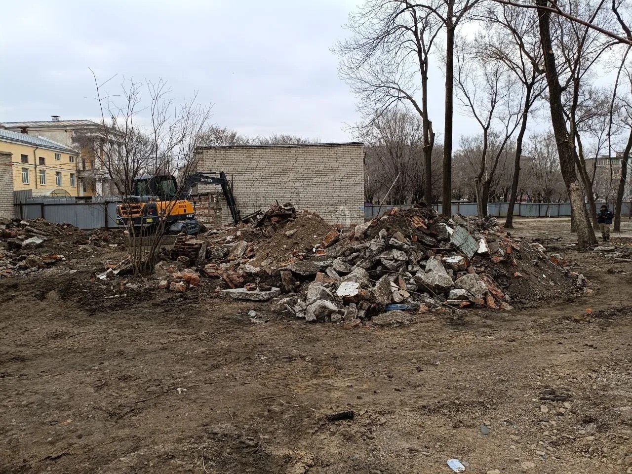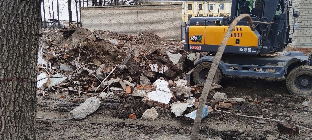 В парке «ДОРА» выполнена разметка для прокладывания кабеля и готовятся траншеи. Также подрядчик вывозит демонтированный кирпич и бетон от здания туалета, на месте которого появится обновленный санузел.