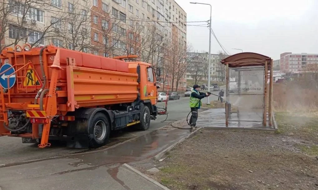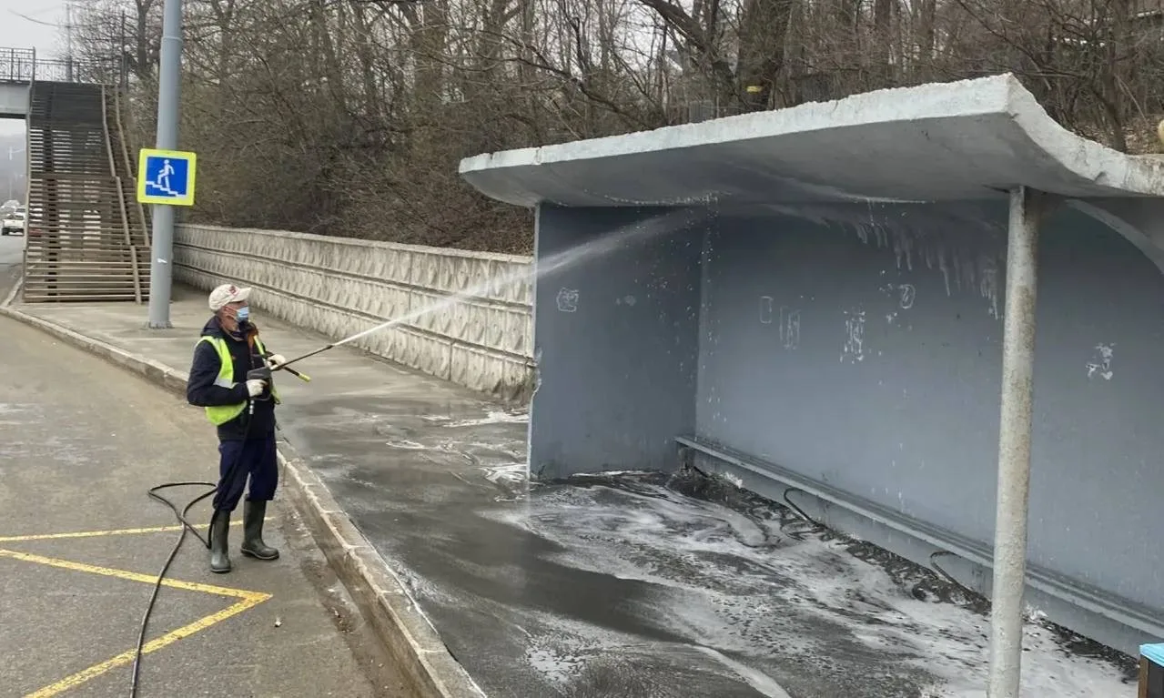 Советский район — помывка остановок общественного транспорта на проспекте 100-летия Владивостока и улице Маковского.