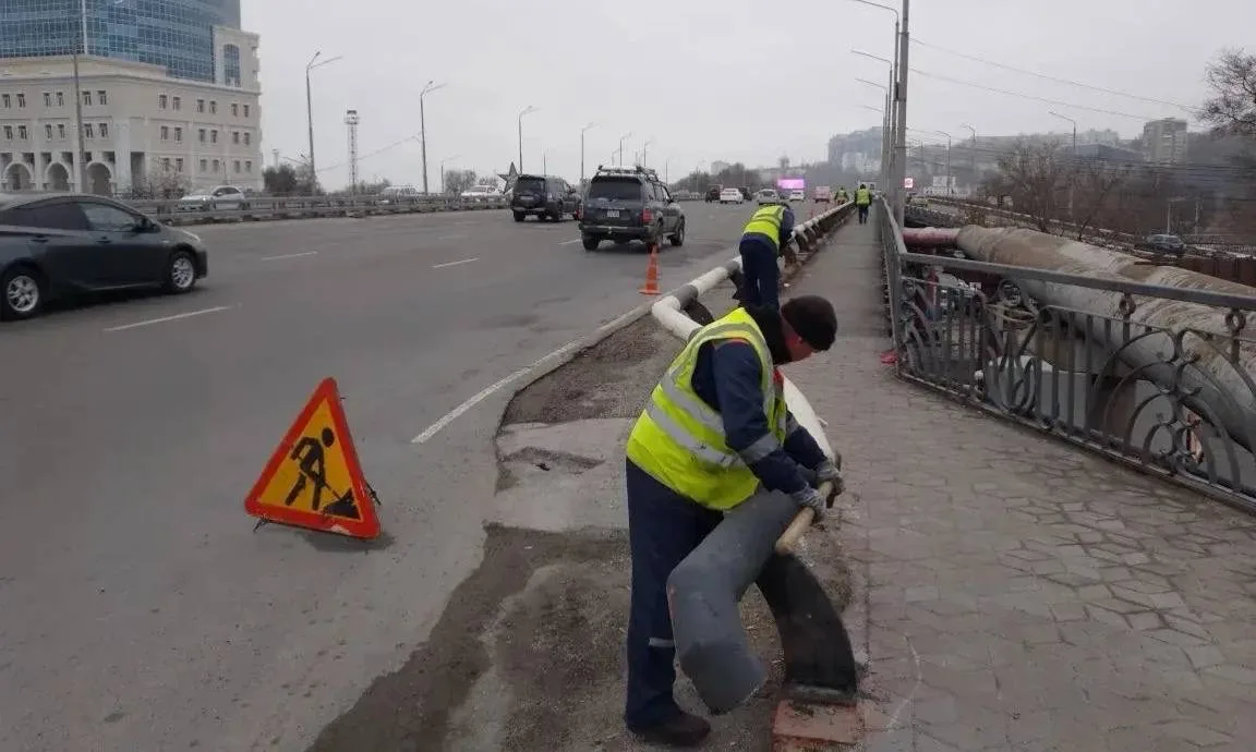 Специализированная бригада выполняет подготовку к окрашиванию защитных дорожных ограждений на транспортной развязке Гоголя.