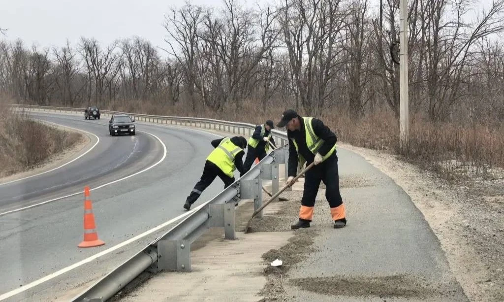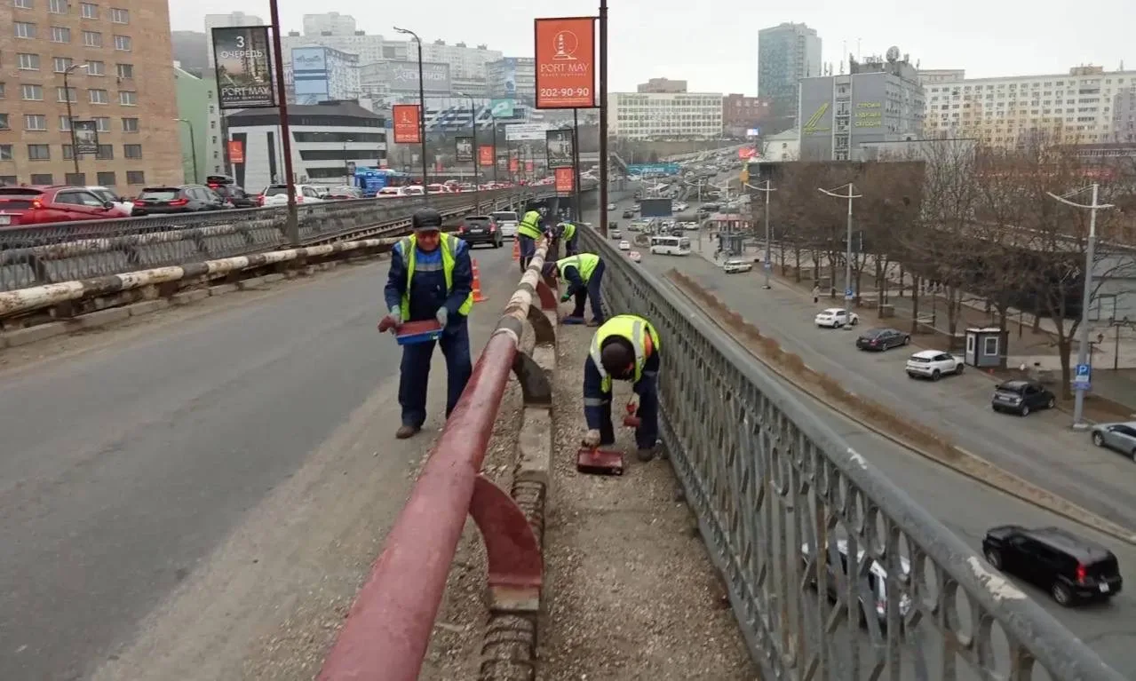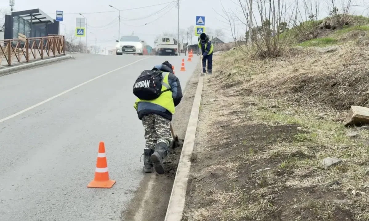 Дорожные службы выполняют устройство остановочного кармана на улице Русской, укрепление откоса, ремонт подпорной стены и устранение дефектов асфальтобетонного покрытия тротуара на улице Хабаровской, 31а, проливку трещин битумом на улице Экипажной (о. Русский), а также уборку грунтовых наносов на трассе Седанка–Патрокл.