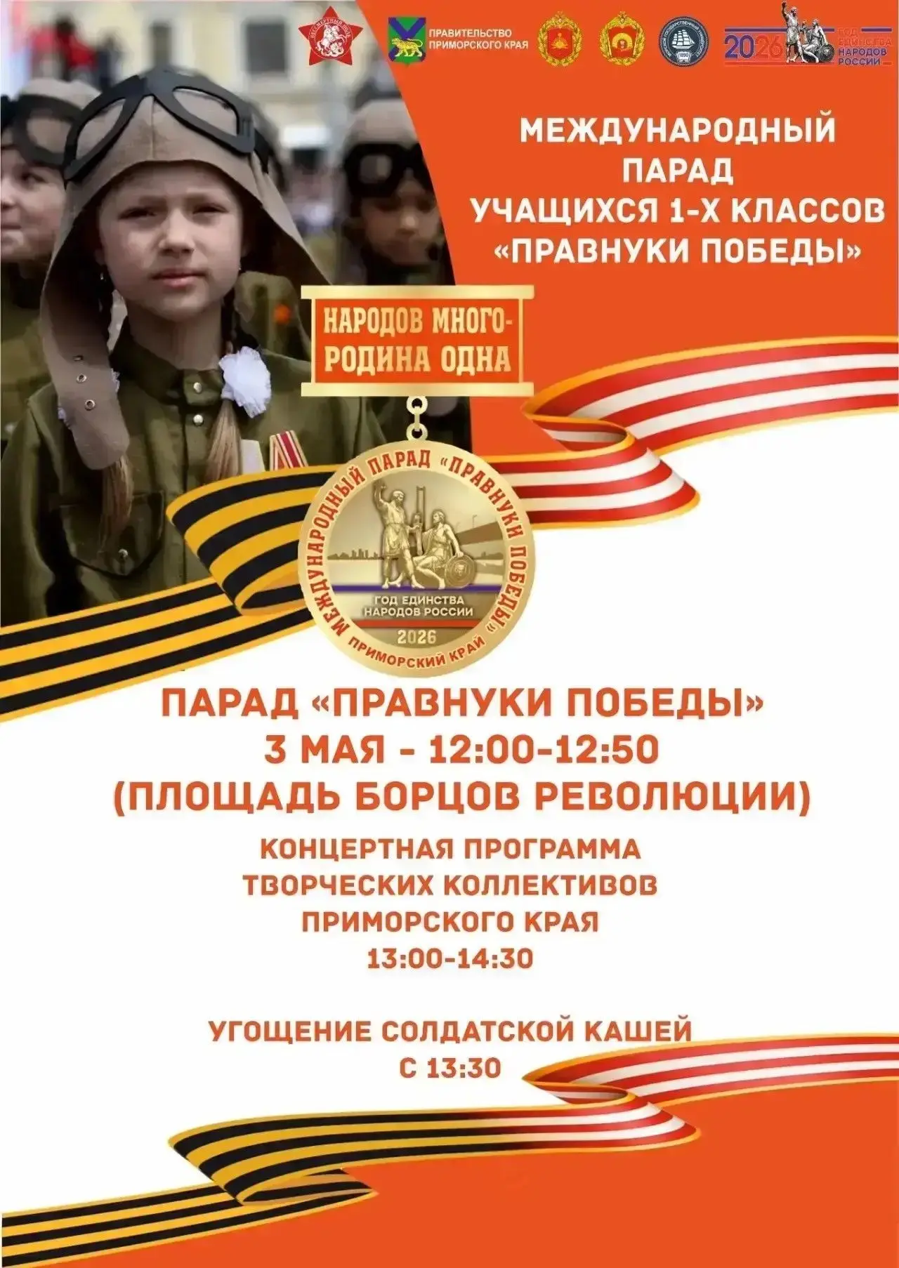 На площади Борцов Революции во Владивостоке 3 мая состоится международный парад «Правнуки Победы». В этом году он посвящён Году единства народов России и теме преемственности поколений.