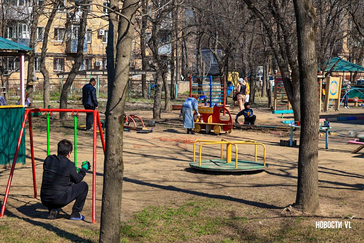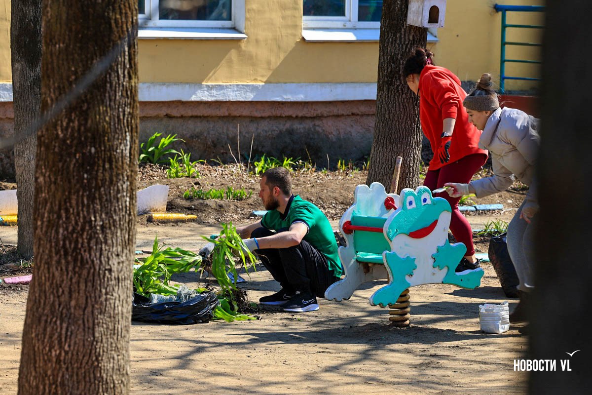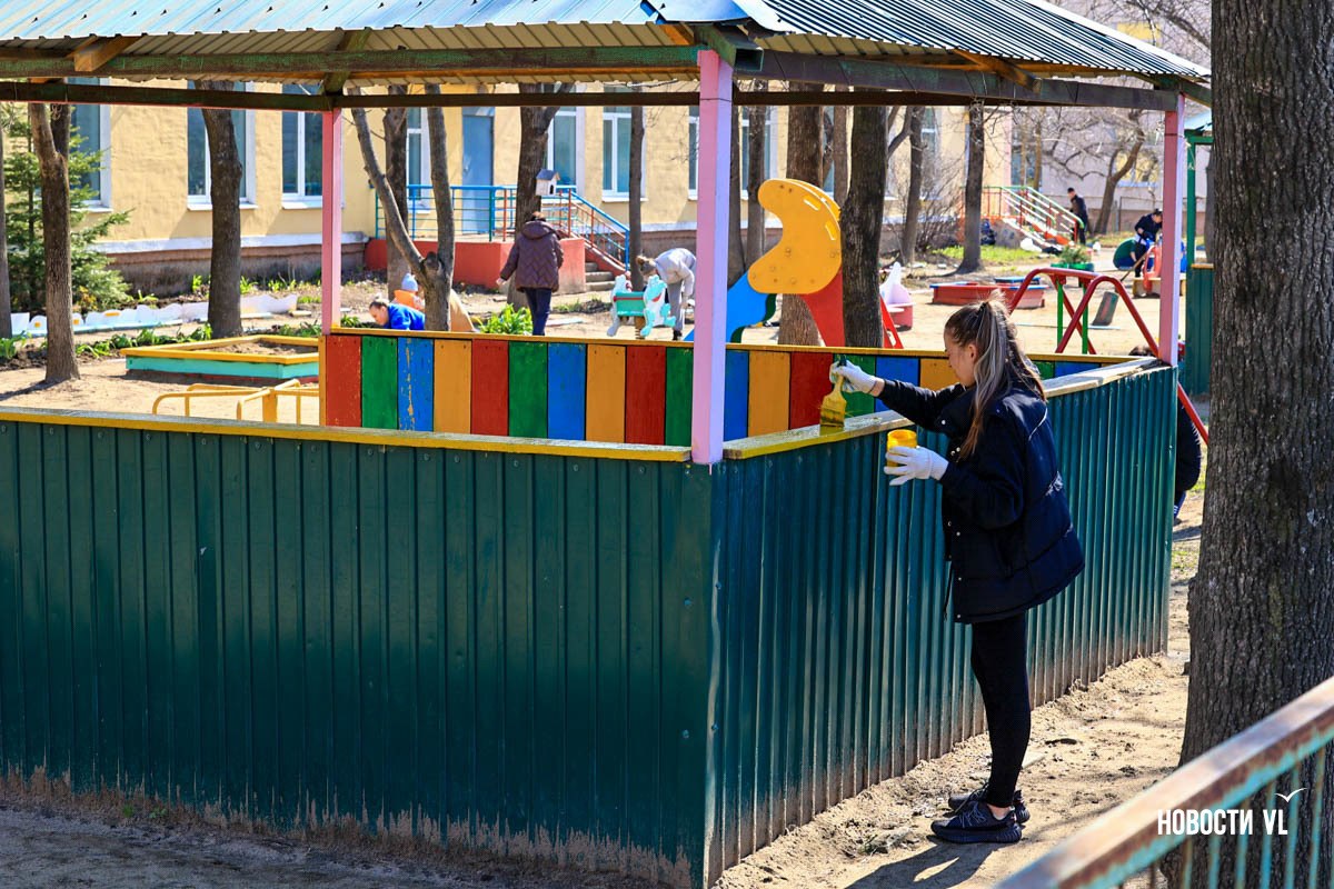На субботник вышли и родители, и воспитатели. Метут, красят горки, качели, беседки. Дети – тоже с мамами и папами. Их помощь – в основном в моральной поддержке.Подробнее на сайте NewsVL.ruПодпишись...
