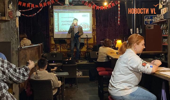 Внутри свободно, люди расселись в разных уголках бара: кто-то за барными стойками, кто-то за отдельными столиками перед самой сценой. Даже рыжий кот, житель «Контрабанды», вышел к сцене вспомнить правила русского языка. Начали с приветствия и просмотра «хобостей» – юмористического ролика с новостями акции «Тотальный диктант». Подробности – скоро на нашем сайте.