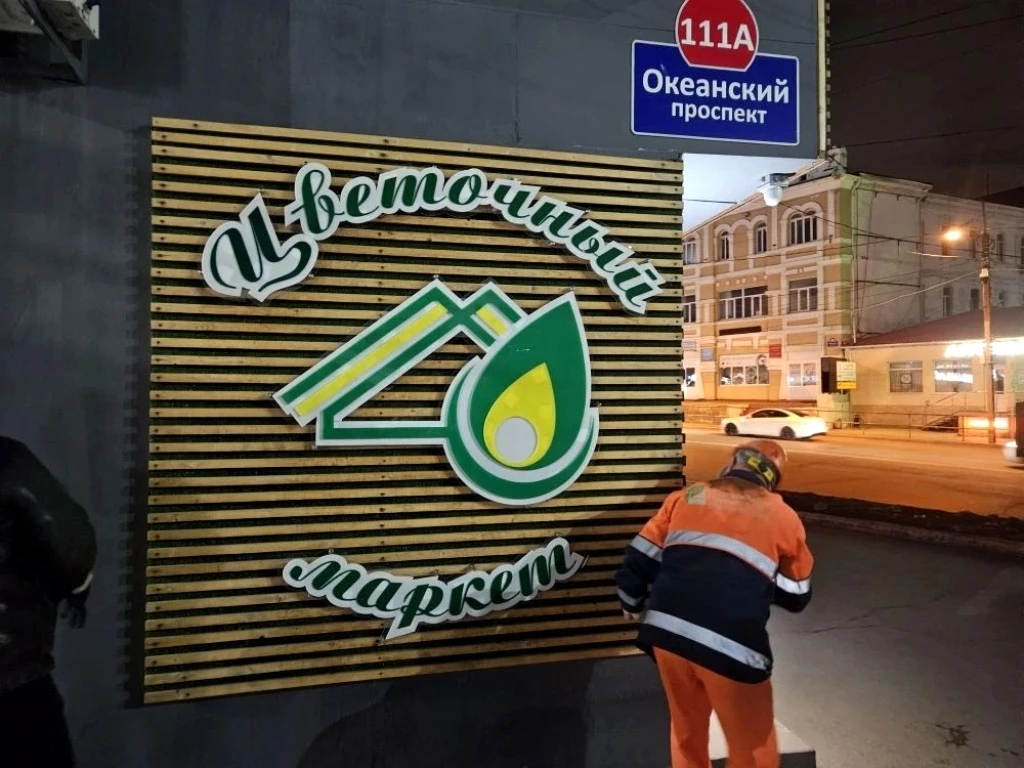 Бригады муниципальной дорожной службы «Содержание городских территорий» убрали такие конструкции с фасадов зданий на Океанском проспекте, 111 и 111а.