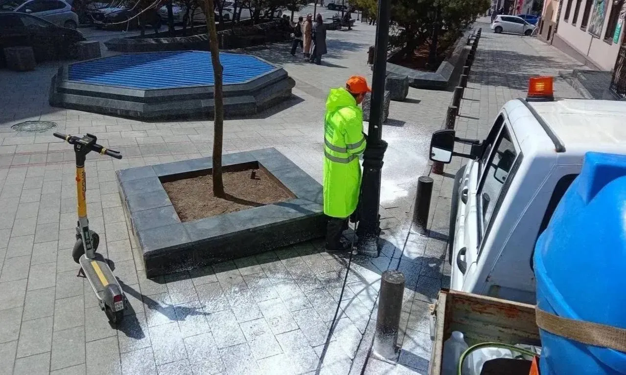 Кроме того, рабочие «СГТ» продолжают промывать тротуары вручную и с помощью поливомоечных машин, а также приводят в порядок автобусные остановки.