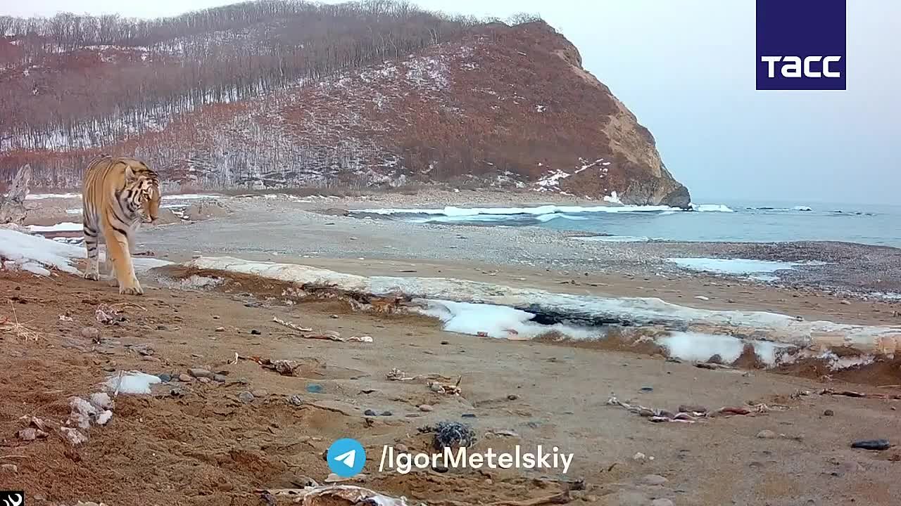 Неторопливую прогулку амурского тигра зафиксировали в Приморском крае.