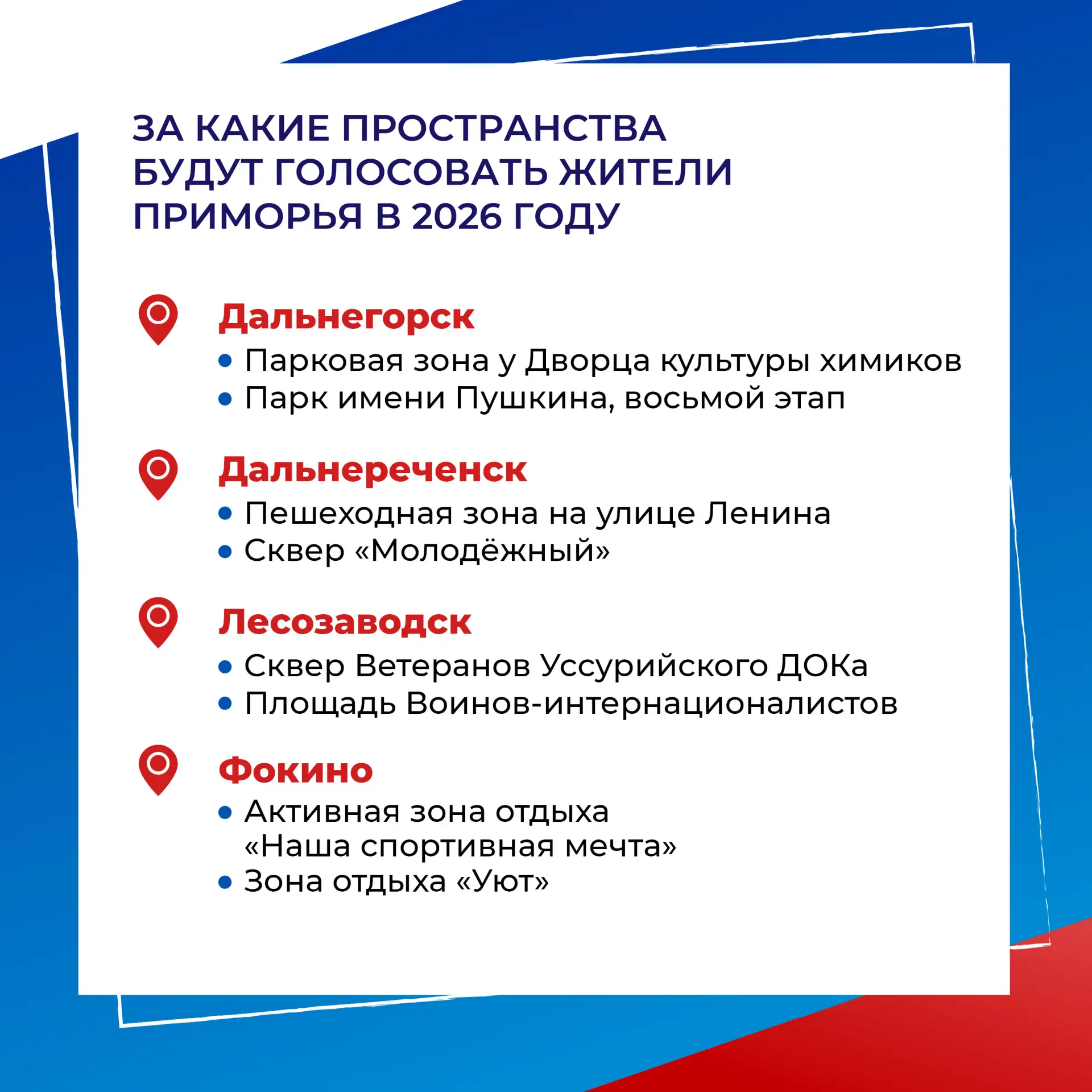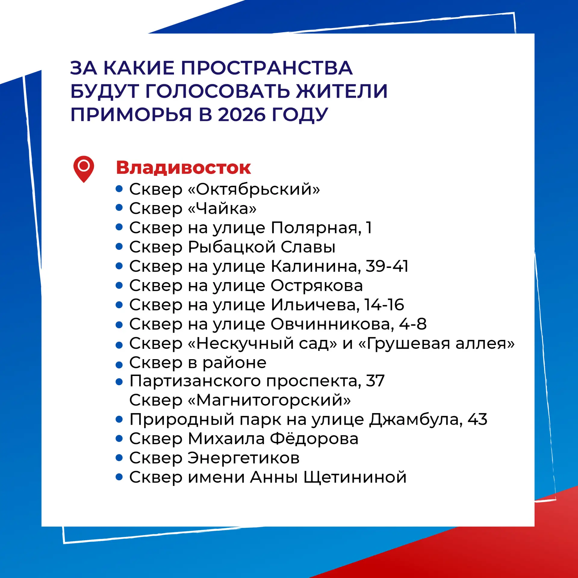 В Приморье стартовало голосование за объекты благоустройства. Собрали для вас в карточках места, которые предлагают выбрать жителям края. А отдать свой голос можно по ссылке: zagorodsreda.gosuslugi.ru