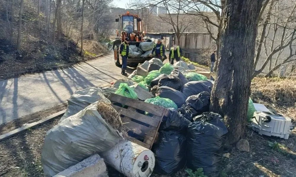 Первомайский район — комплексная уборка на улице Сафонова; вывоз мешков после субботника с социальных объектов.