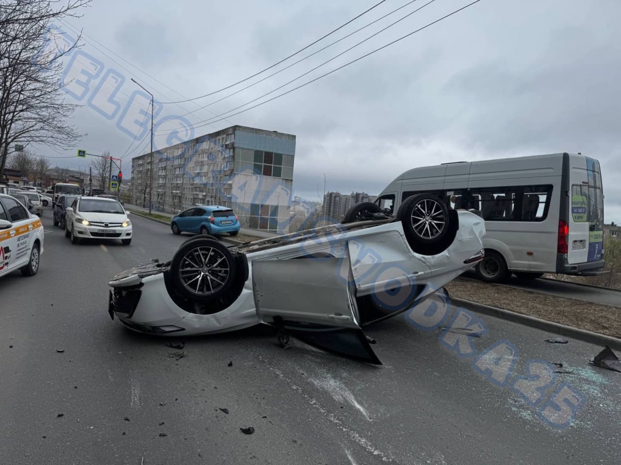 Во Владивостоке на улице Нейбута водитель Toyota Camry на высокой скорости врезался в припаркованные автомобили, после чего машина перевернулась на крышу