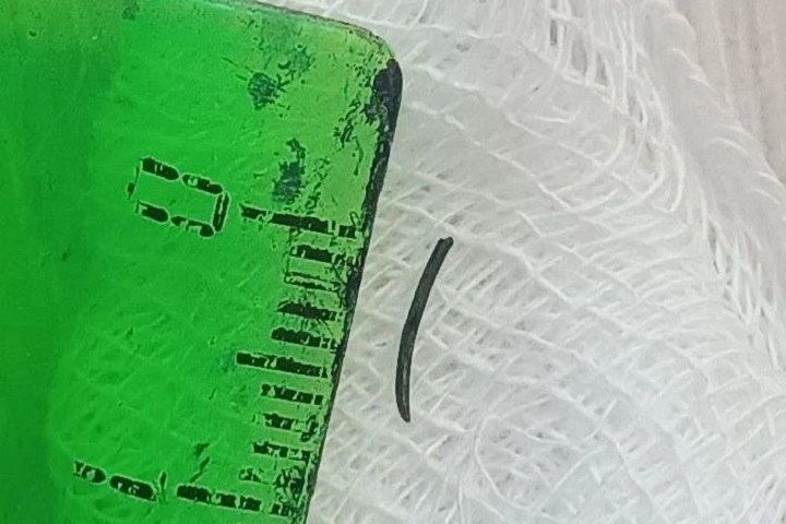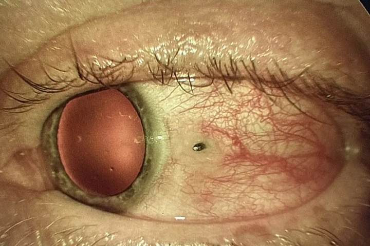 Металлическая щетинка отлетела от инструмента и вонзилась мужчине в глаз. Пациент самостоятельно обратился в травмпункт ККБ № 2: часть проволоки торчала снаружи, а другой конец прошел внутрь глазного яблока, остановившись в 3,5 мм от роговицы.