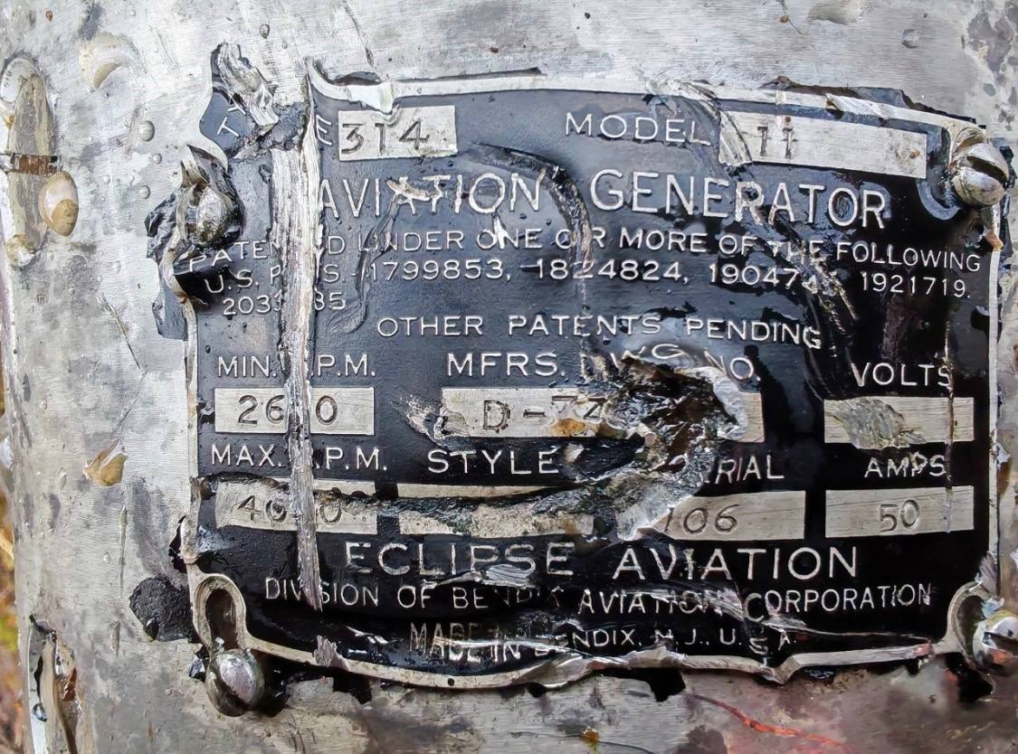 Представленная выше табличка была найдена на генераторе самолета. Это табличка с данными генератора Eclipse Aviation (тип E314, модель 11), произведенного компанией Eclipse Aviation, подразделением Bendix Aviation Corporation, Бендикс, Нью-Джерси, США. Рассчитанный на 50 ампер, с диапазоном оборотов 2600–4000 об/мин, он обеспечивал электропитание самолетов, на которых он работал.