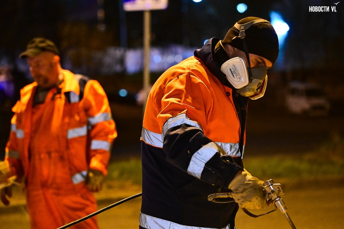 С наступлением тепла на дорогах Владивостока началось активное обновление стёршейся за зиму разметки. Работает одновременно сразу несколько бригад МБУ «Содержание городских территорий» и преимущественно по ночам. Пока одни наносят полоски пешеходных переходов через краскопульт, другие при помощи специальной машины размечают дорожные полосы. Как и в каждой сфере деятельности, тут есть и свои тонкости, и своя магия, секретные ингредиенты. К примеру, вместе с краской на асфальт насыпают специальные стеклошарики: для колёс они безвредны, но в свете фар ночью делают белые и жёлтые линии более яркими. Новости VL подготовили материал о том, как работают на дорогах люди с перевёрнутым ритмом жизни.