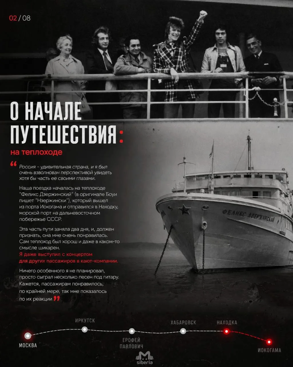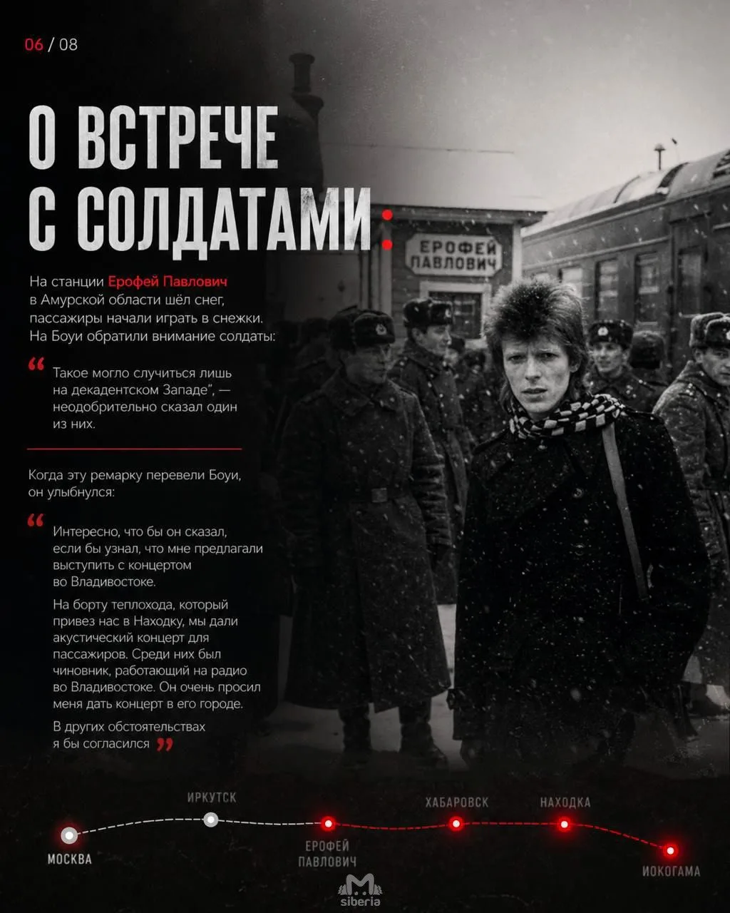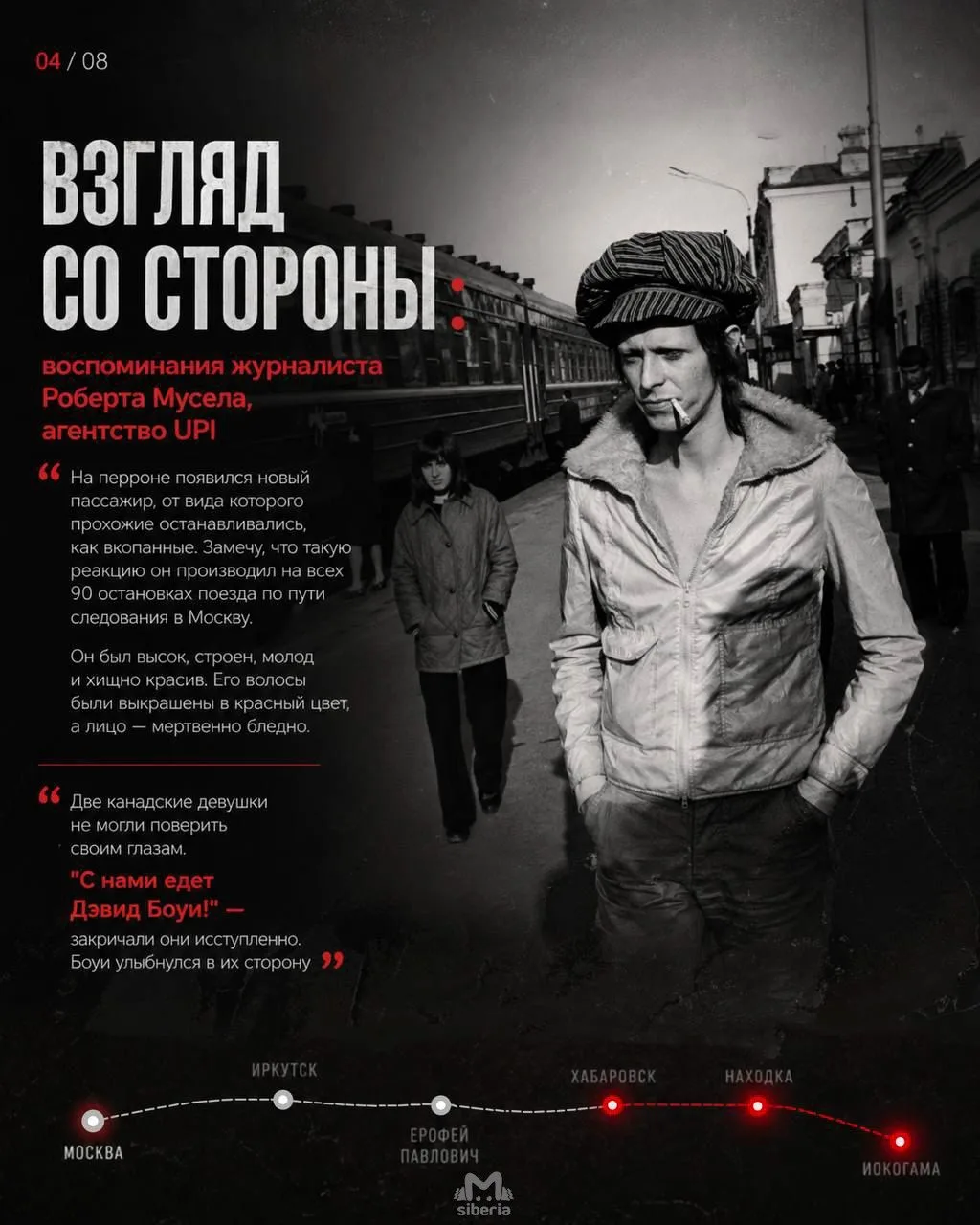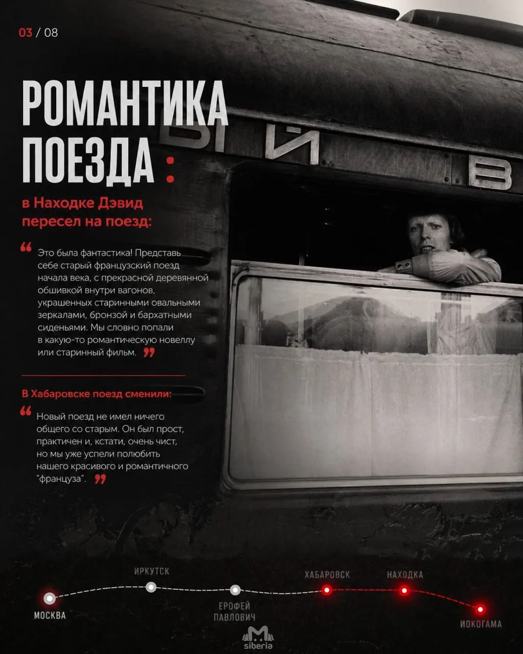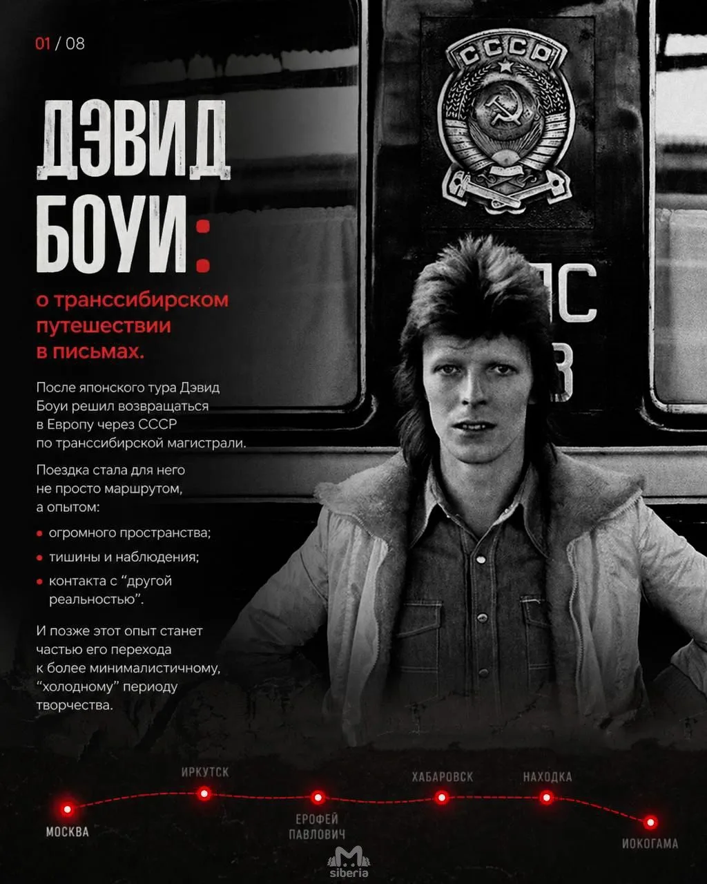 Мировая рок-звезда неделю едет на поезде Владивосток — Москва: поёт песни проводницам, выходит покурить на станциях и ест котлеты в вагоне-ресторане. Это был Дэвид Боуи.